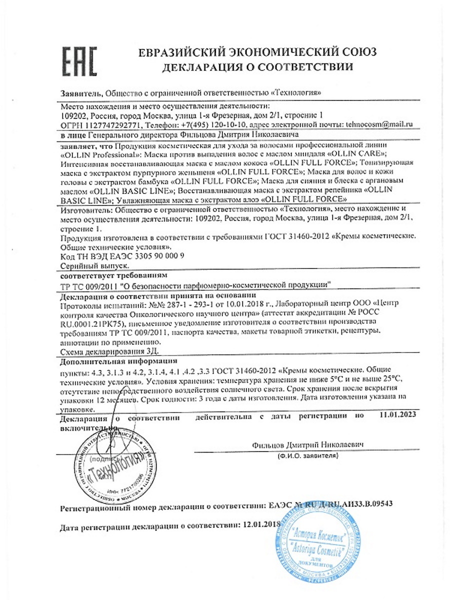 OLLIN PROFESSIONAL Маска FULL FORCE для восстановления волос интенсивная с маслом кокоса 650 мл