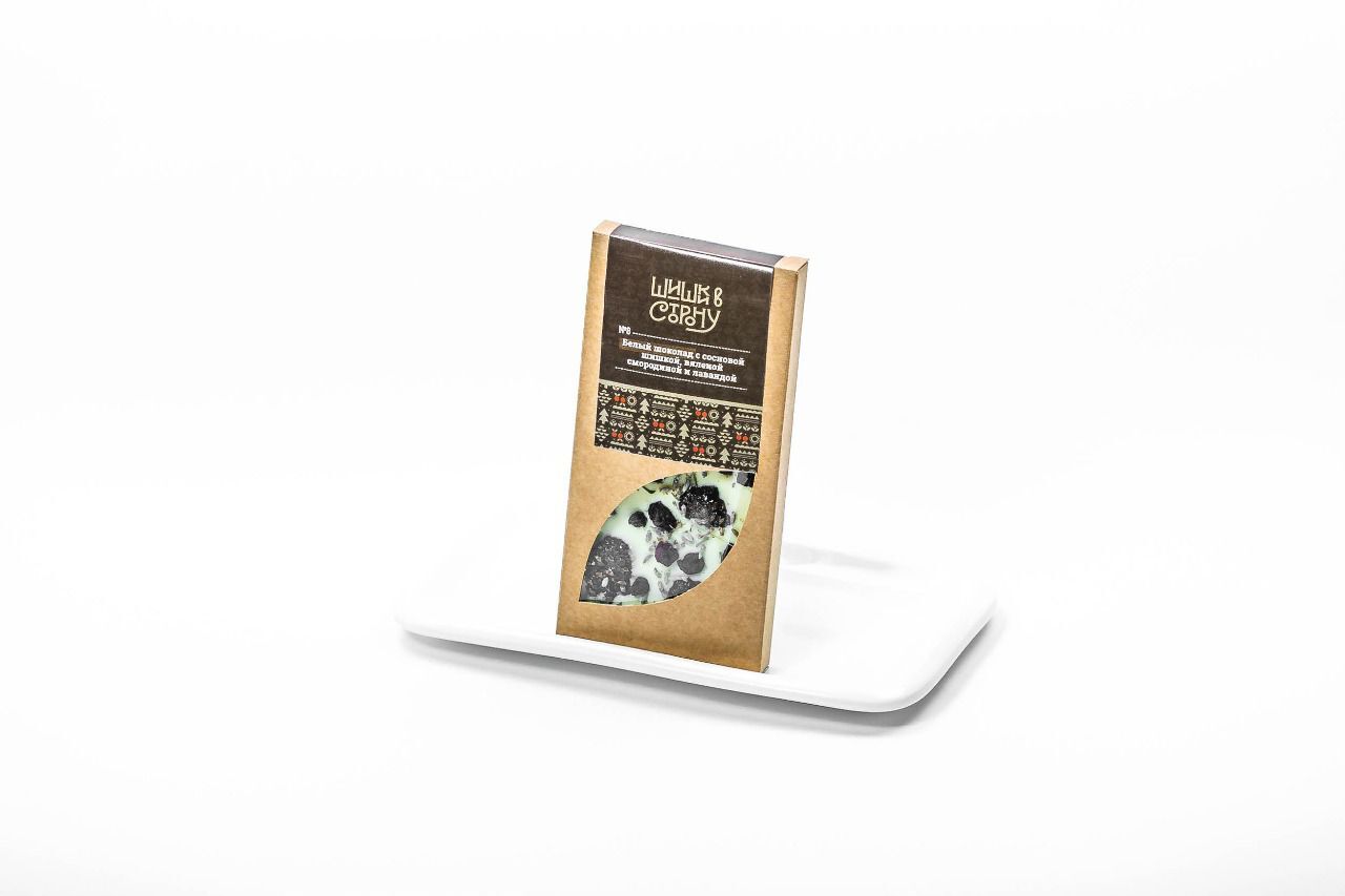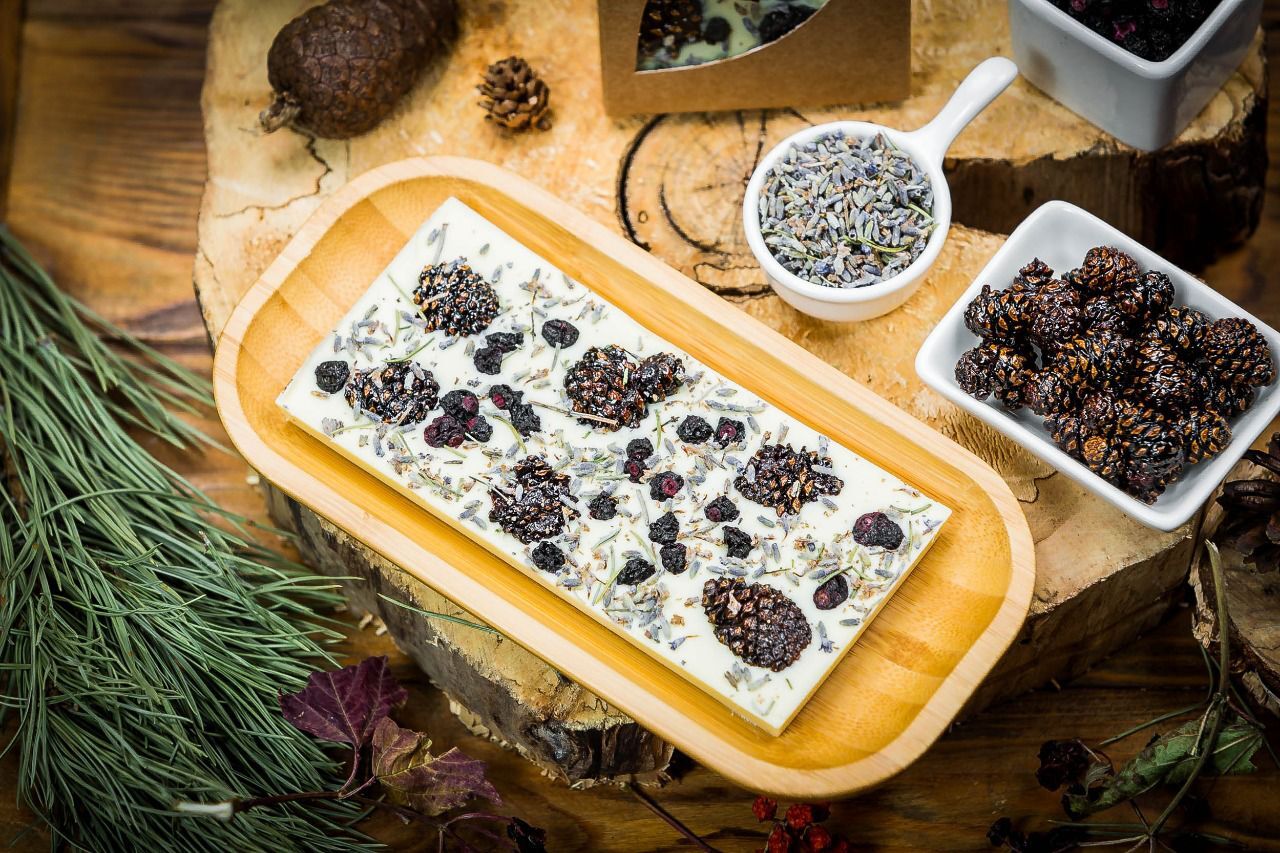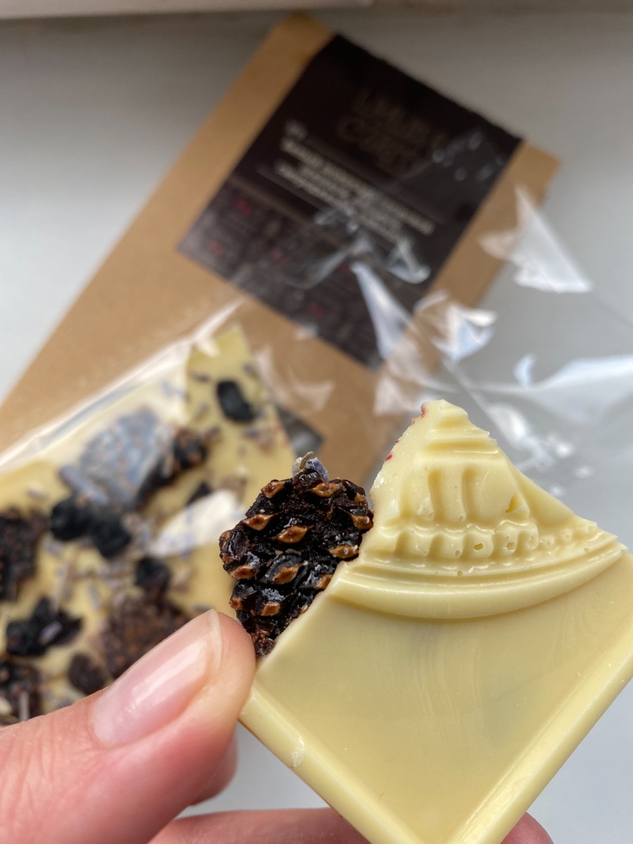 БЕЛЫЙ ШОКОЛАД С СОСНОВОЙ ШИШКОЙ,ВЯЛЕНОЙ СМОРОДИНОЙ И ЛАВАНДОЙ