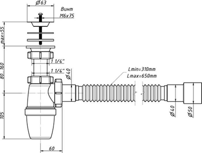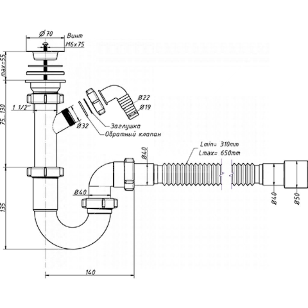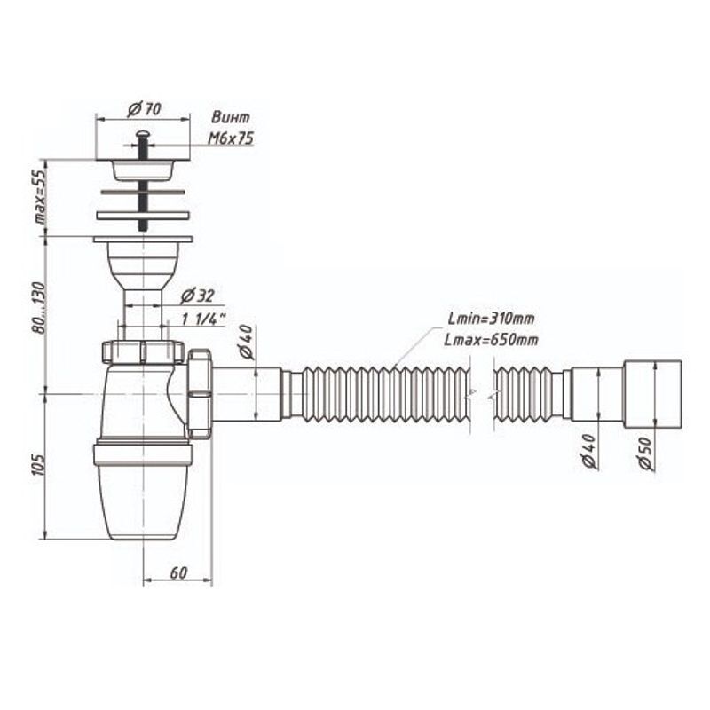 Сифон для раковины 1.1/2" 40мм с гибкой трубой