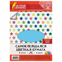 Цветная бумага А4 офсетная самоклеящаяся, 5 листов 5 цветов, звезды, 80 г/м2, остров сокровищ, 210х297 мм, 129301