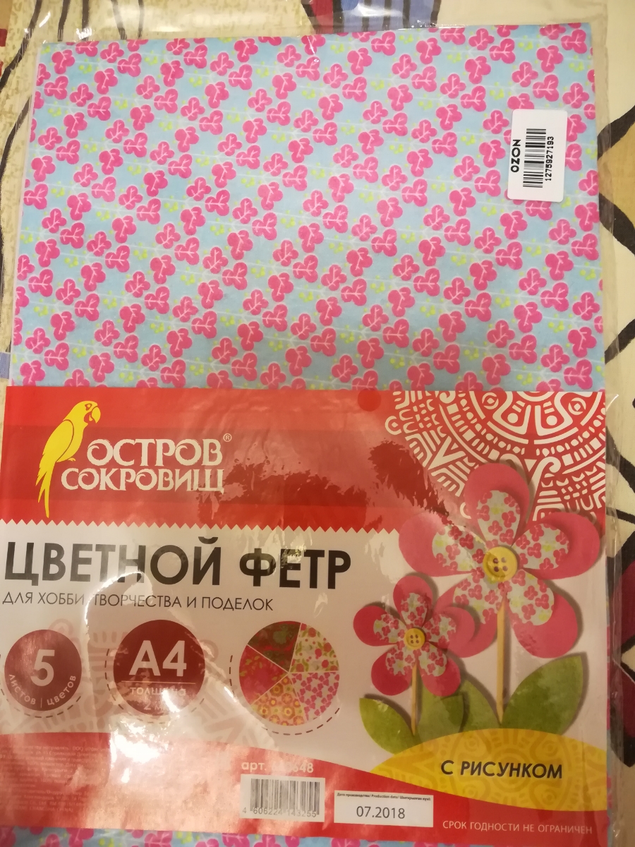 Цветной фетр для творчества, А4, Остров сокровищ, 5 листов, 5 цветов, толщина 2 мм, оттенки розового