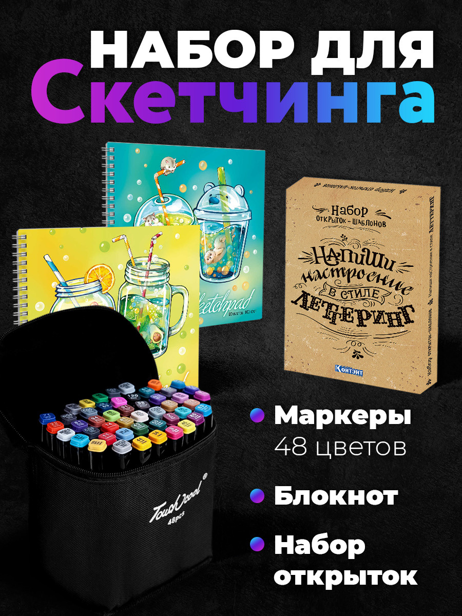 Скетчбук для маркеров + маркеры для скетчинга 48 цветов + линер + набор открыток