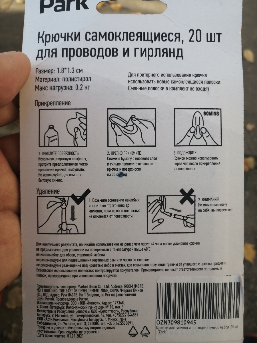 Крючки для гирлянд и проводов самокл. Набор 20 шт. "Park"