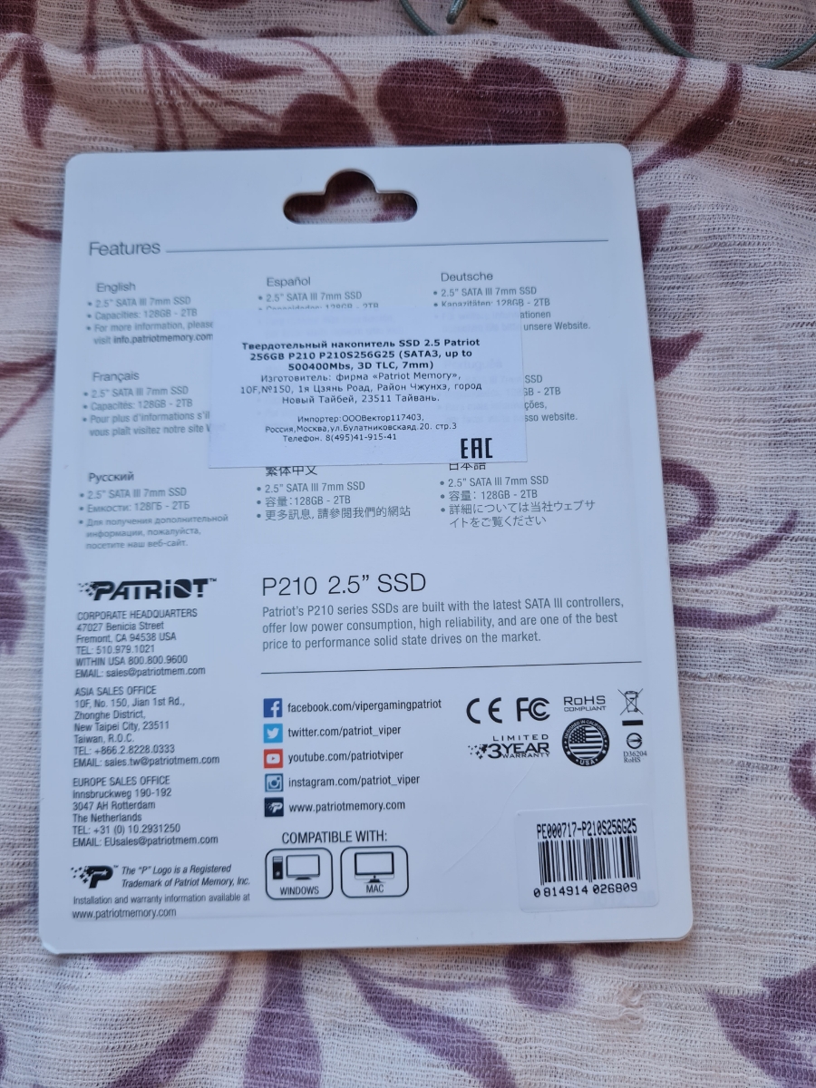 512 ГБ Внутренний SSD диск Patriot Memory P210 2.5" SATA3 6.0 Гбит/с (P210S512G25)