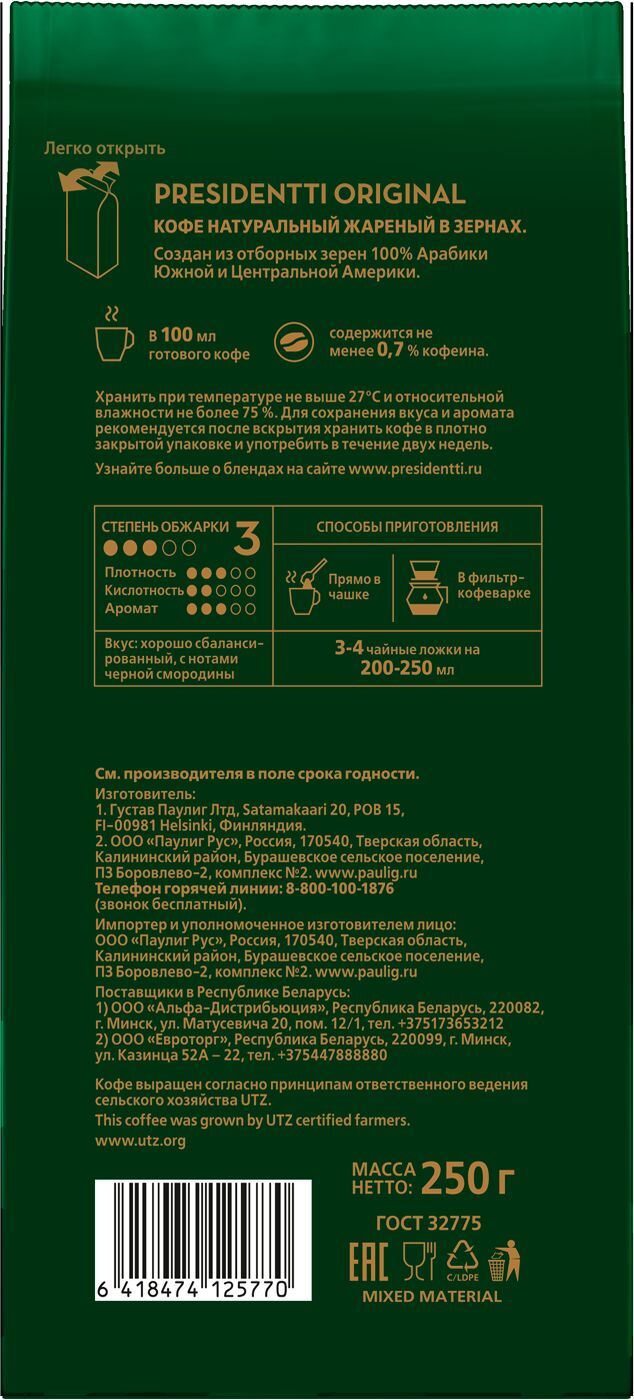 Кофе в зернах Paulig Presidentti Original, 250 г