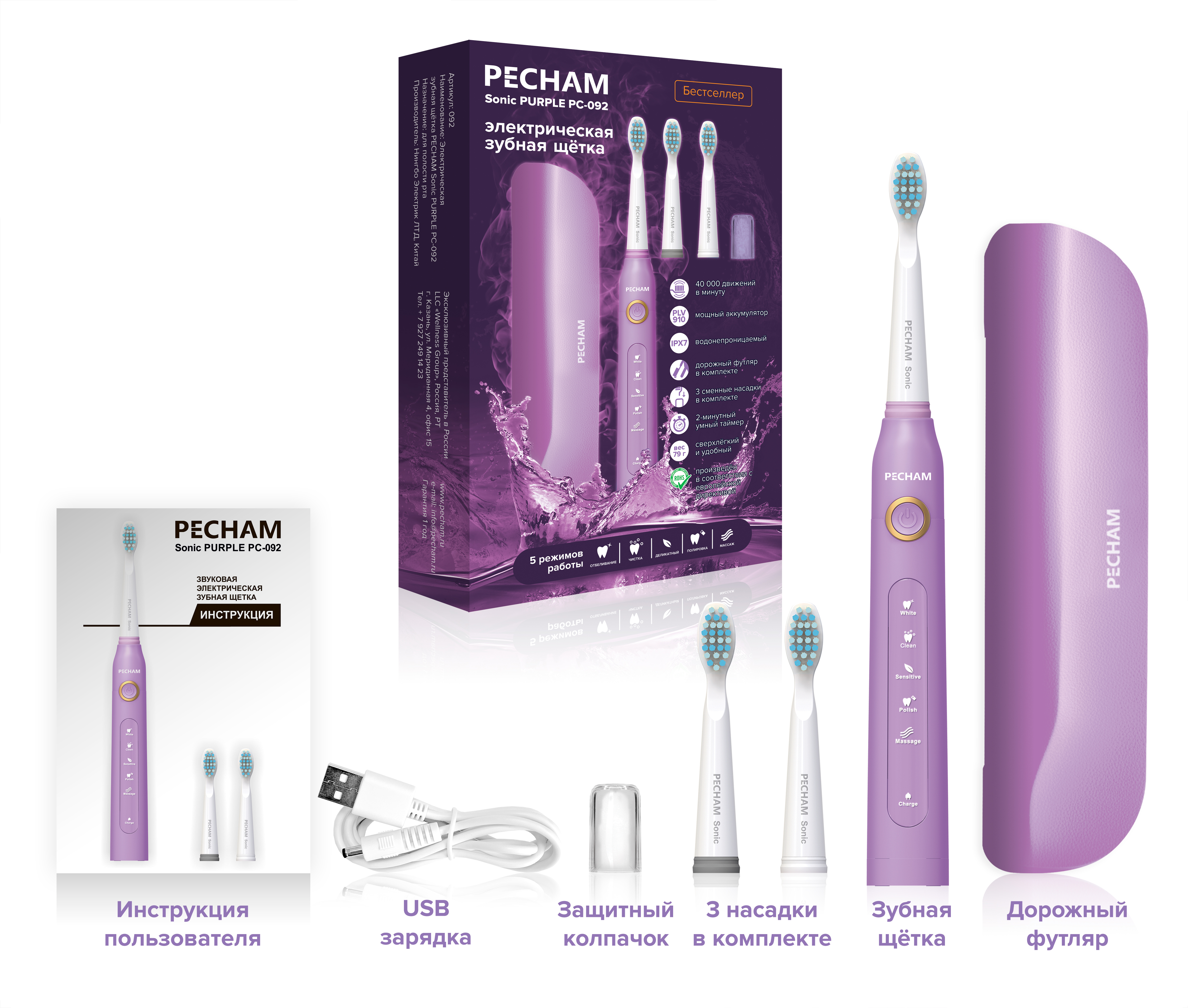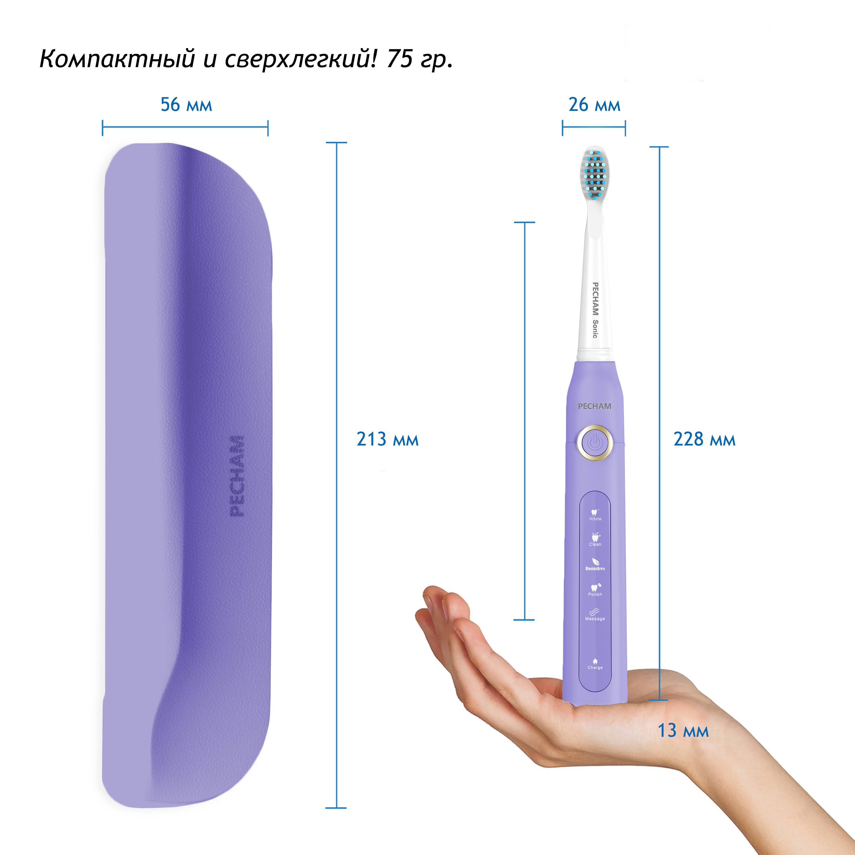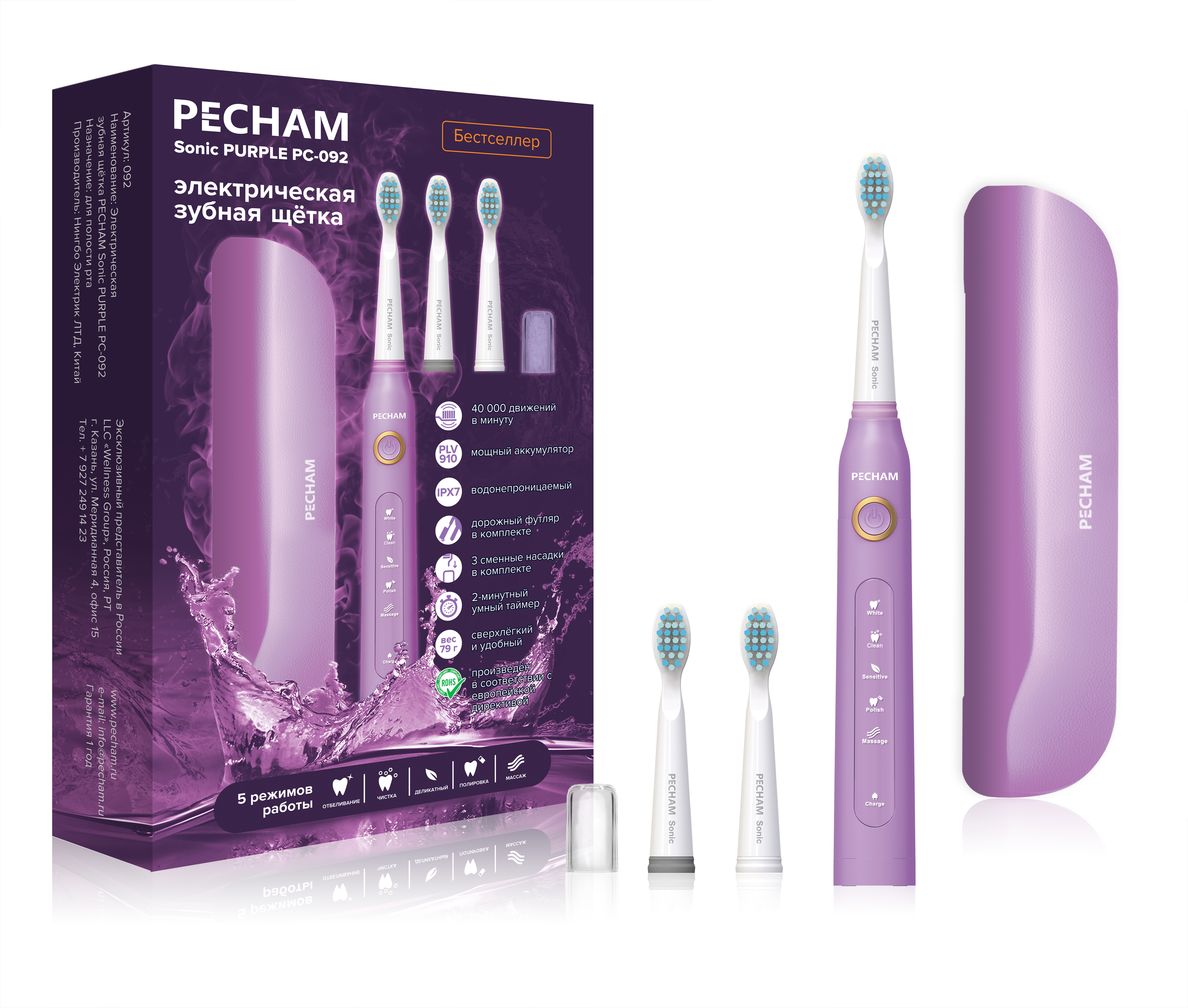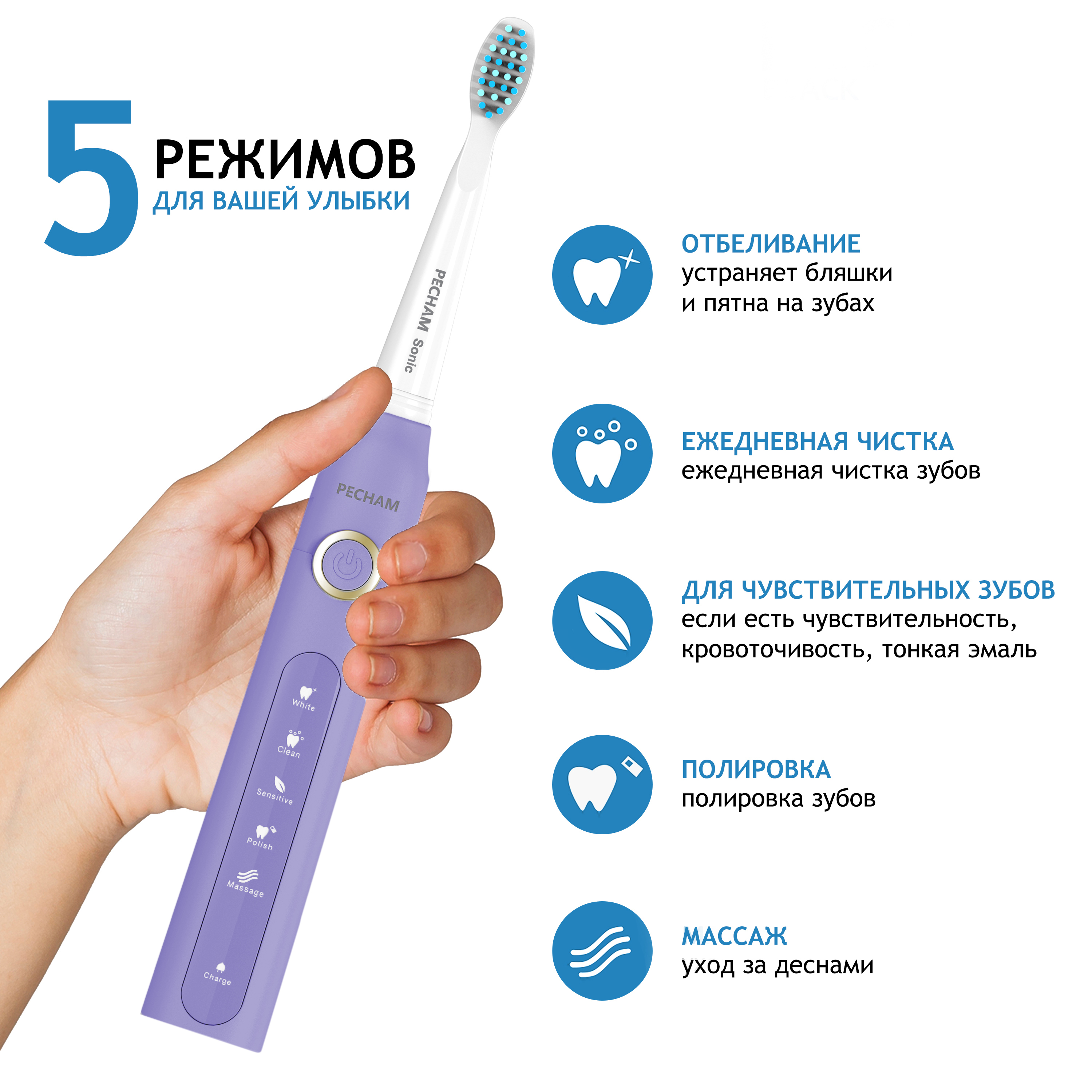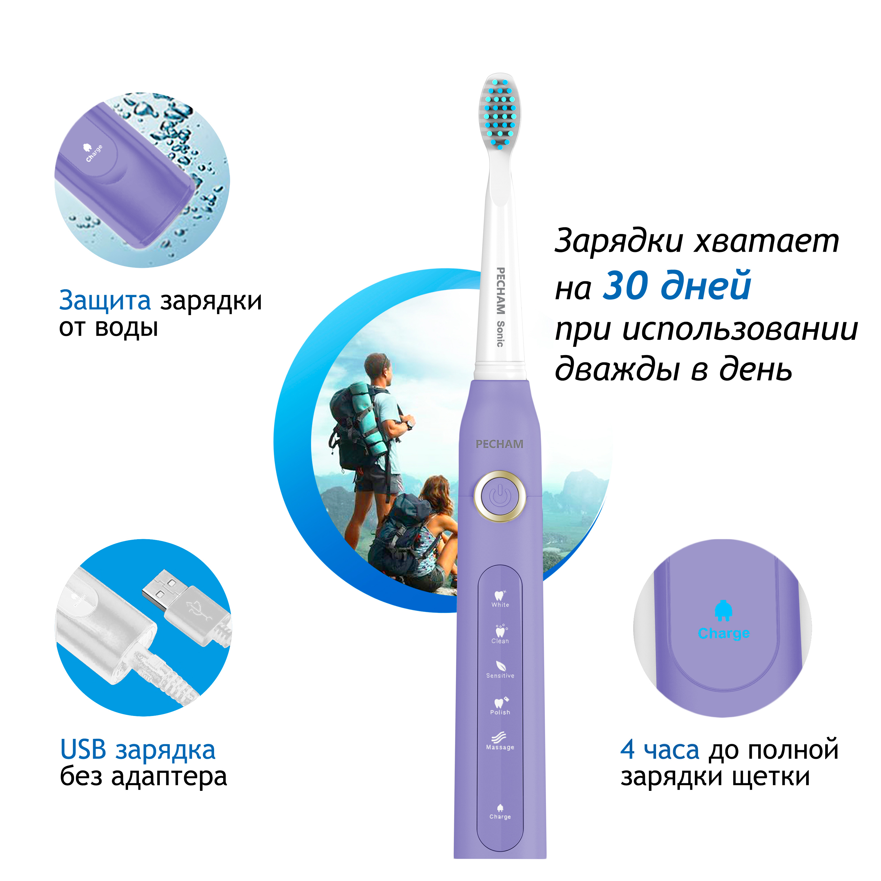 Электрическая зубная щетка PECHAM Sonic Purple, 3 насадки, Дорожный кейс, 5 режимов чистки
