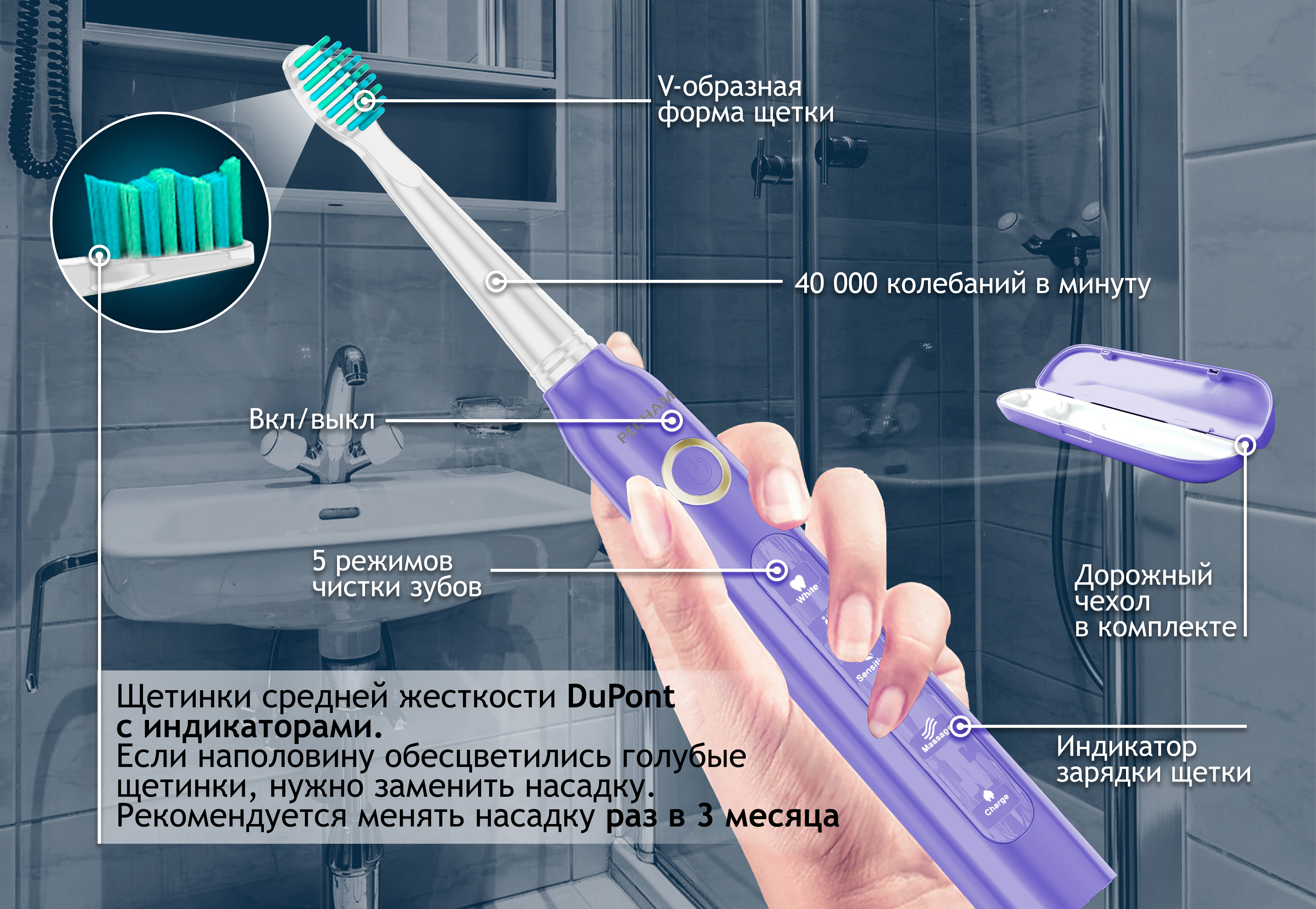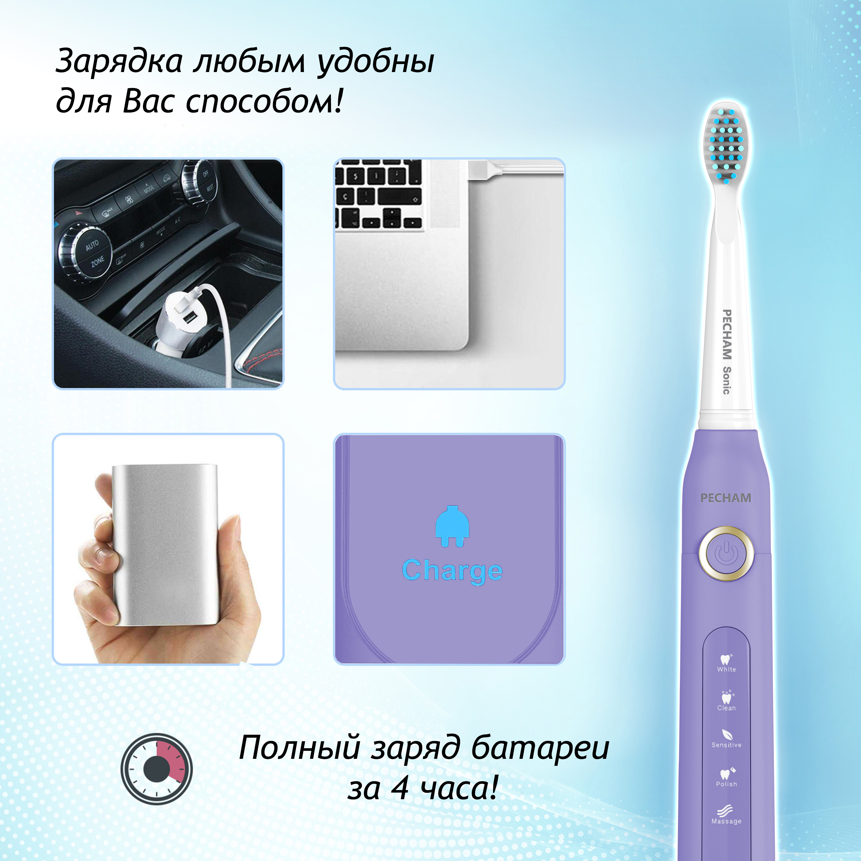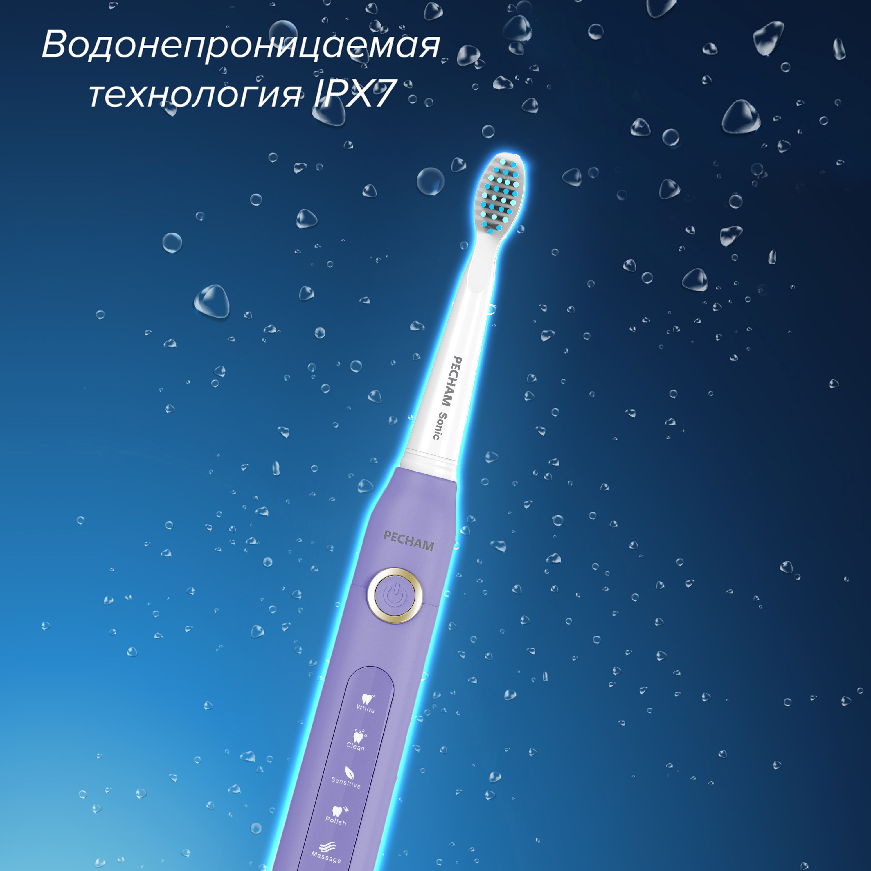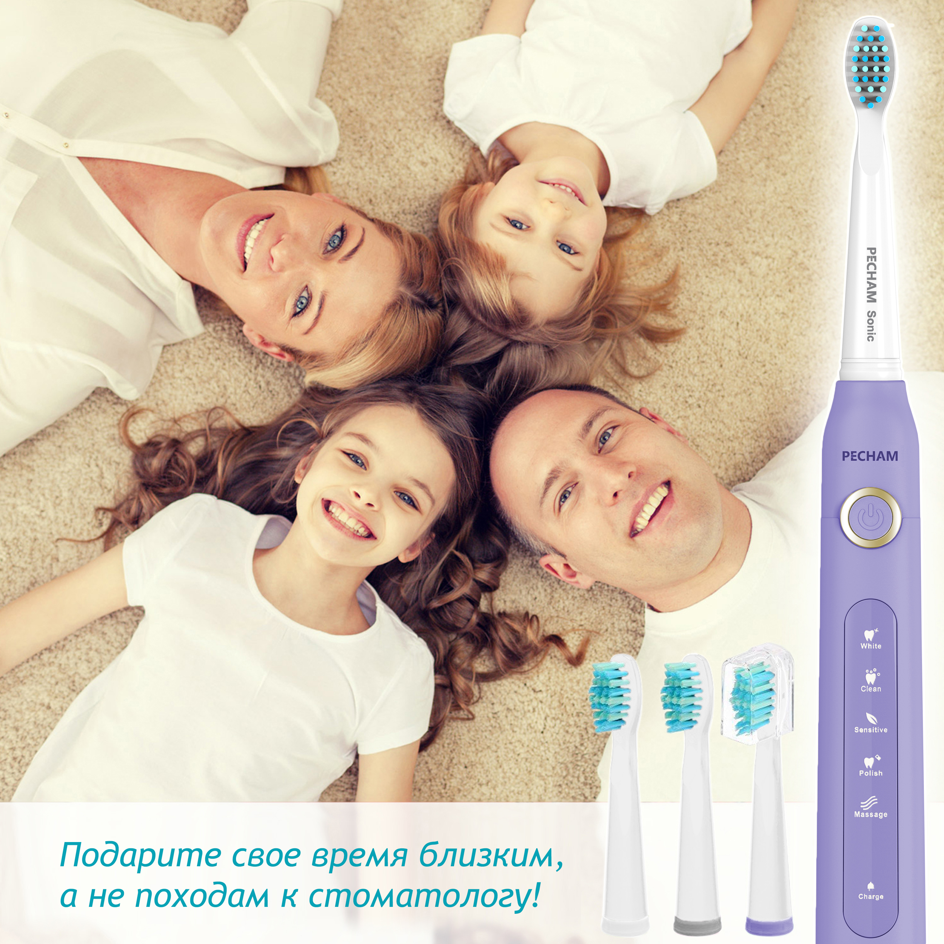Электрическая зубная щетка PECHAM Sonic Purple, 3 насадки, Дорожный кейс, 5 режимов чистки