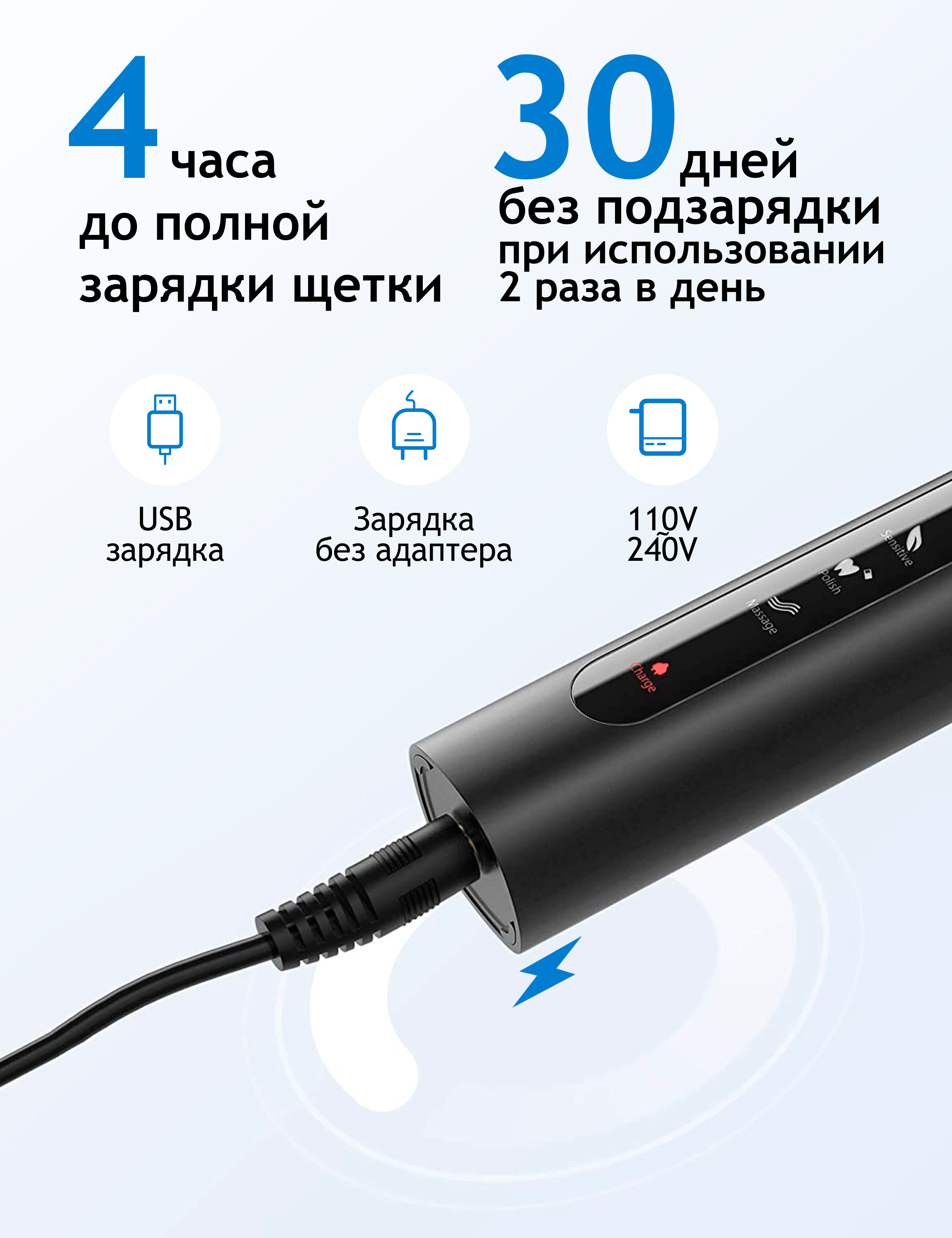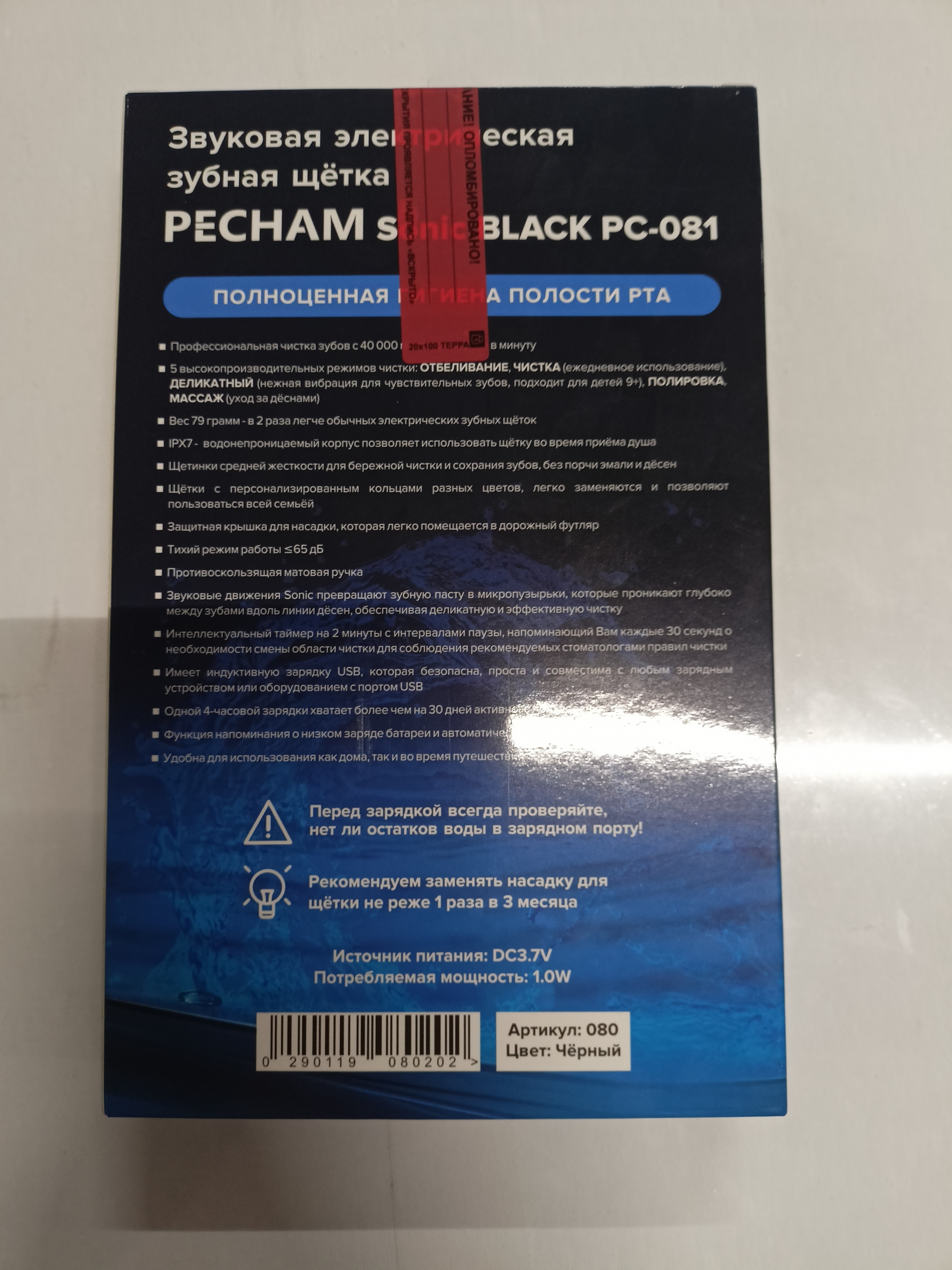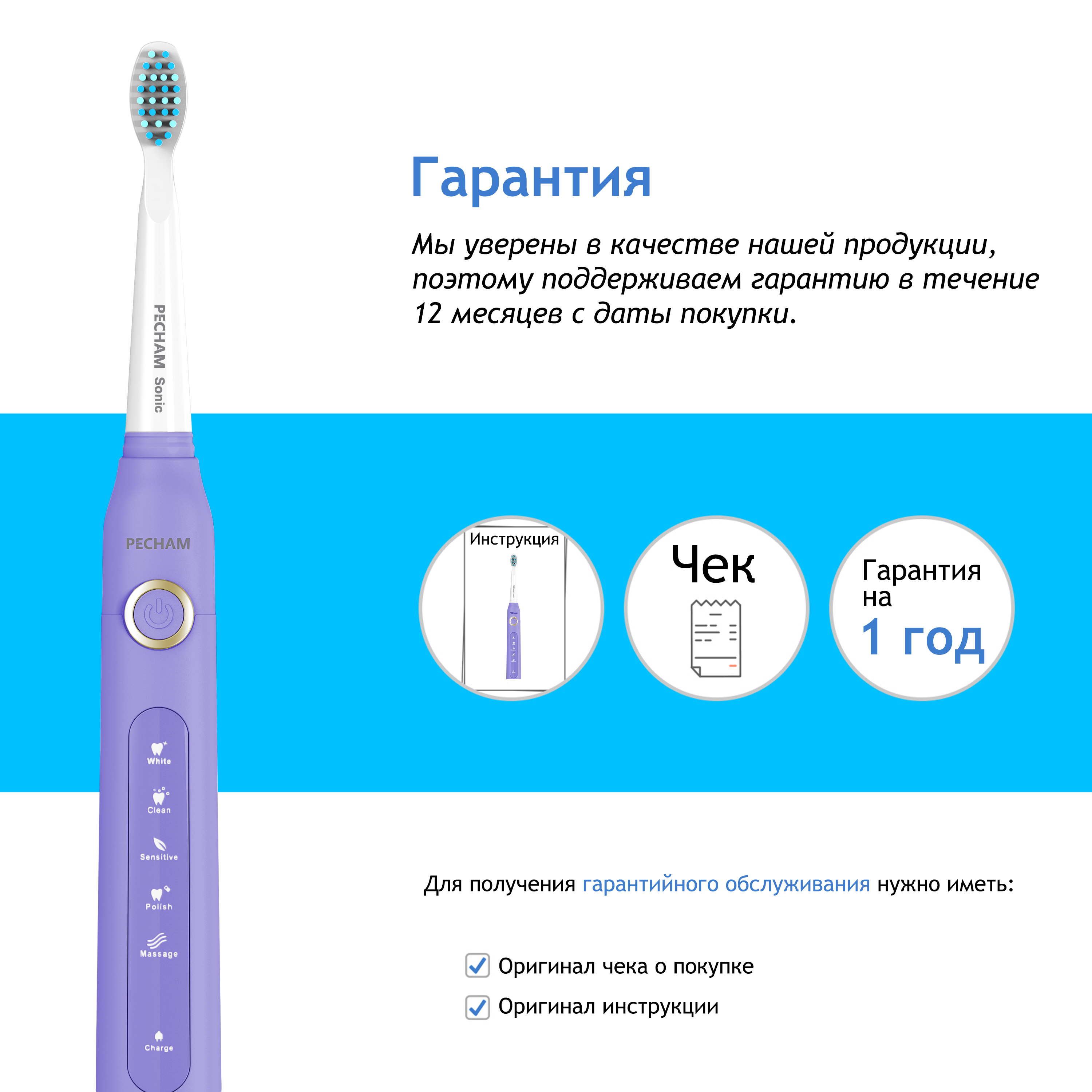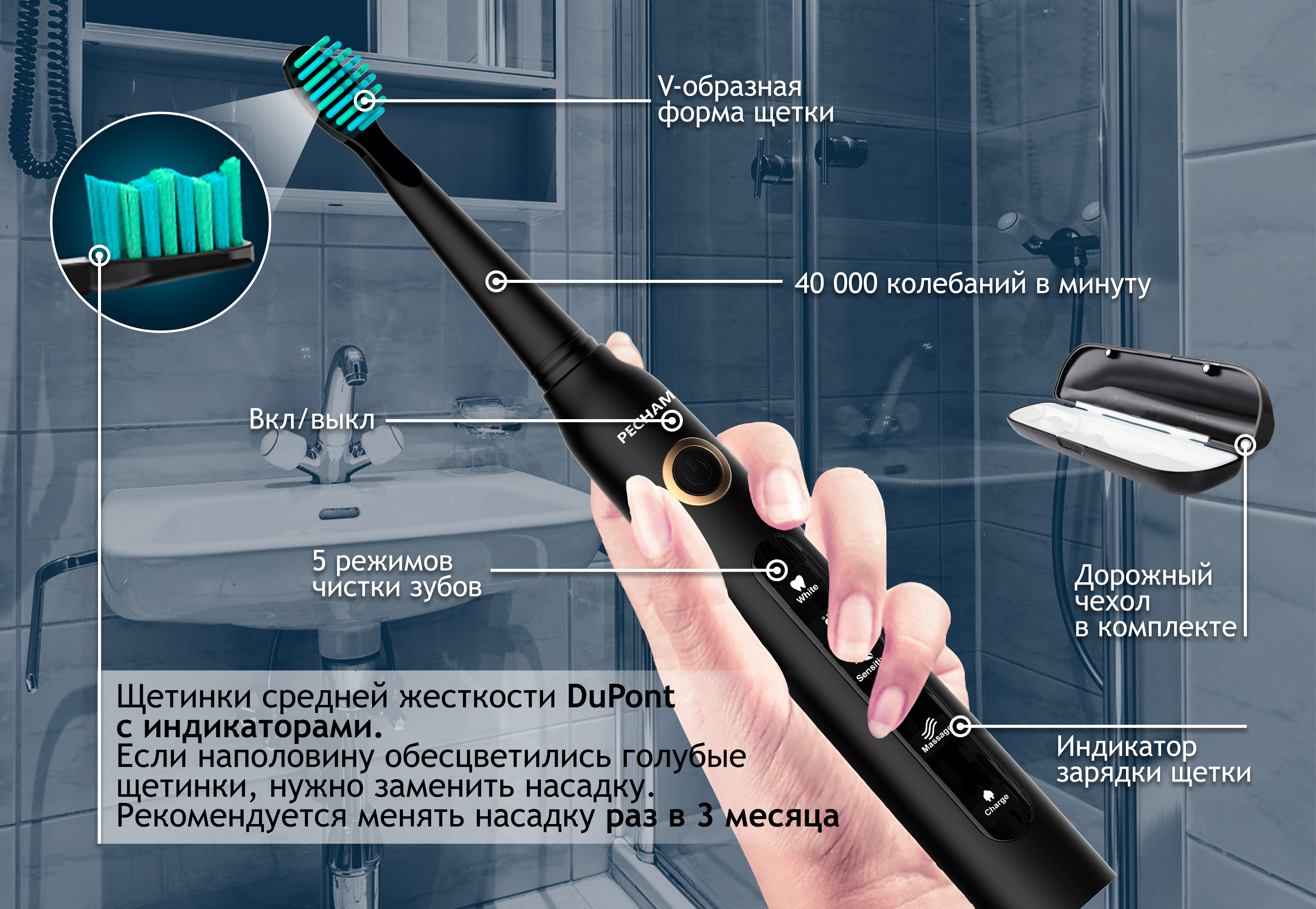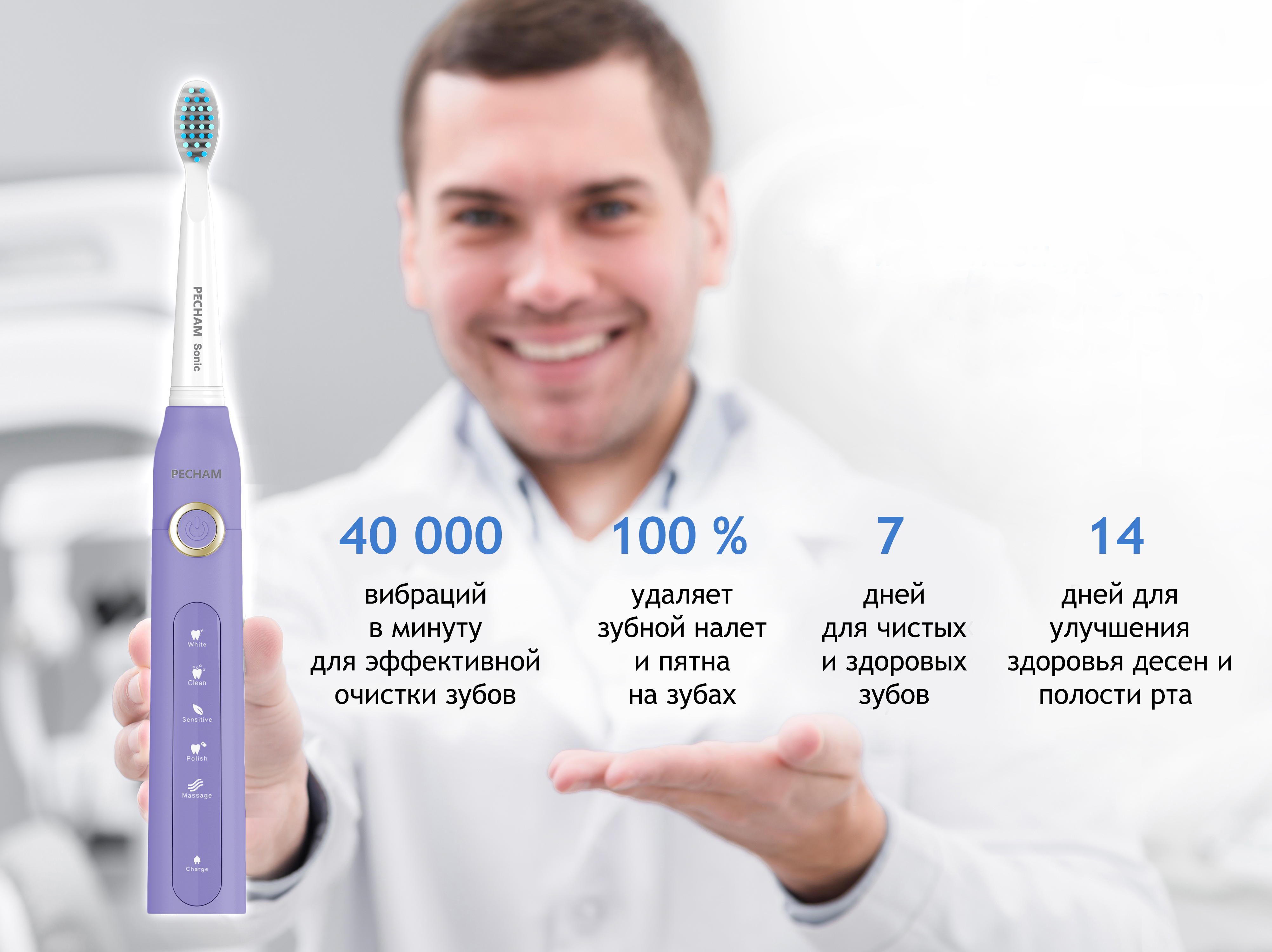 Электрическая зубная щетка PECHAM Sonic Purple, 3 насадки, Дорожный кейс, 5 режимов чистки