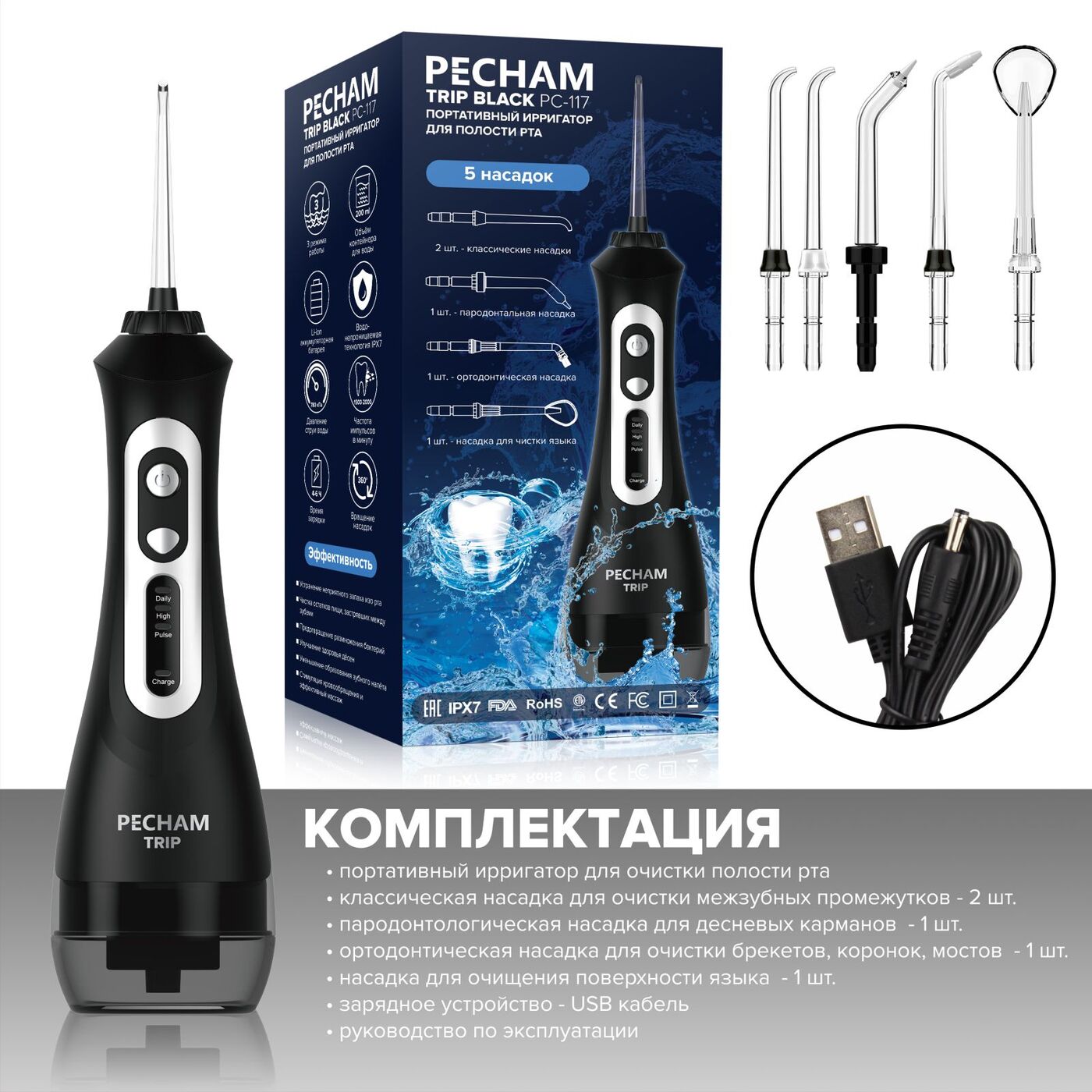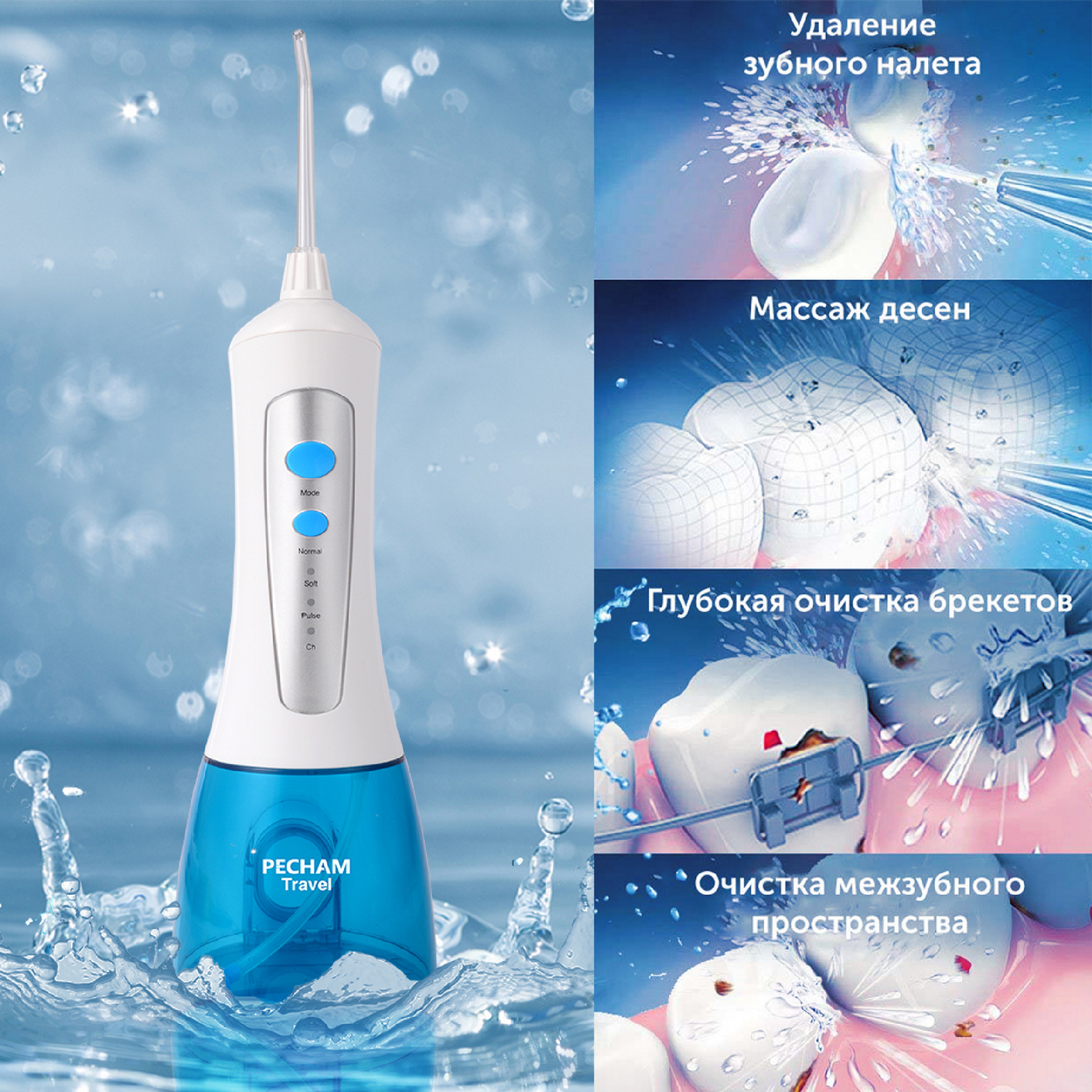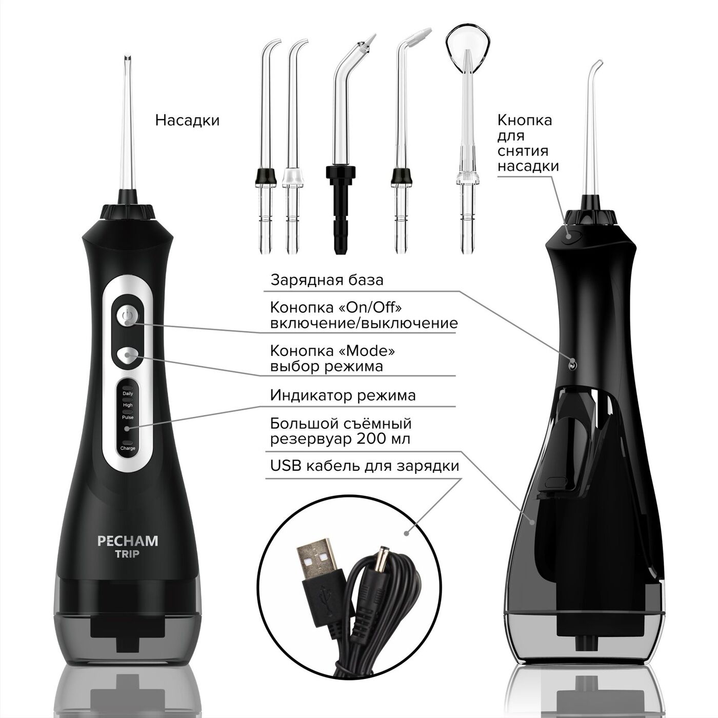 Ирригатор для полости рта Pecham Trip, Портативный, 5 насадок, Емкость 200 мл.