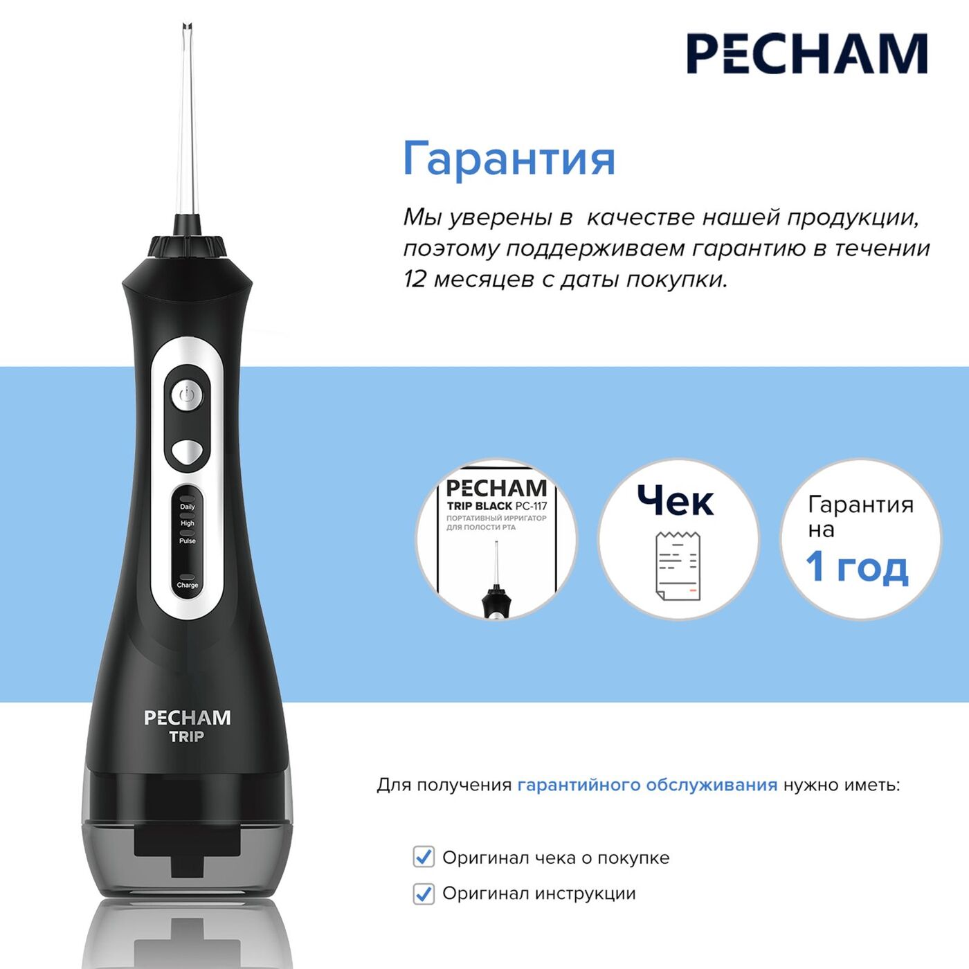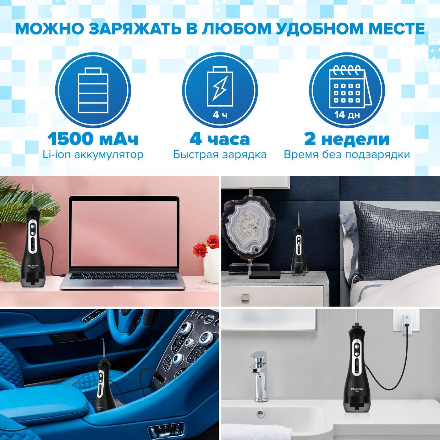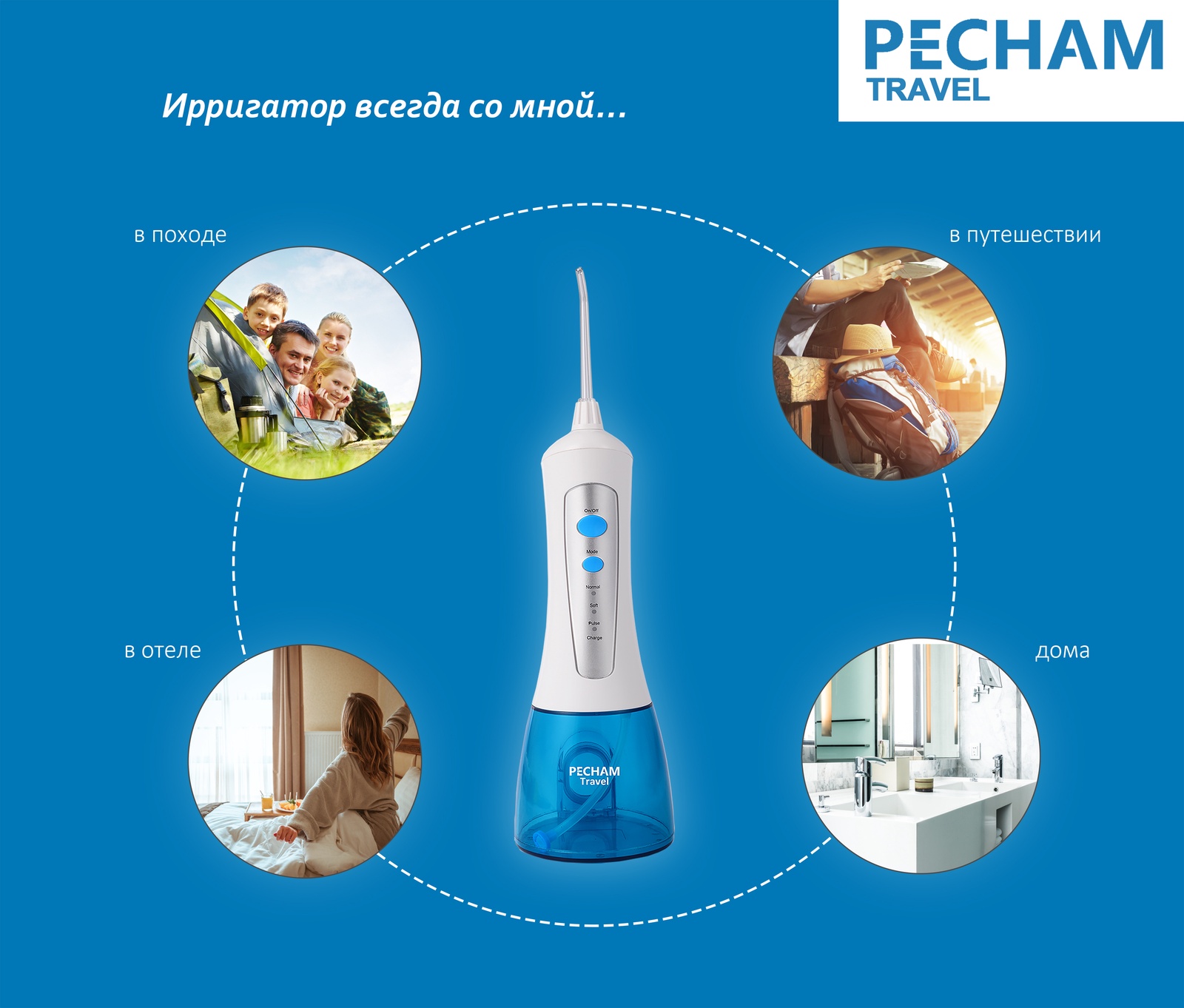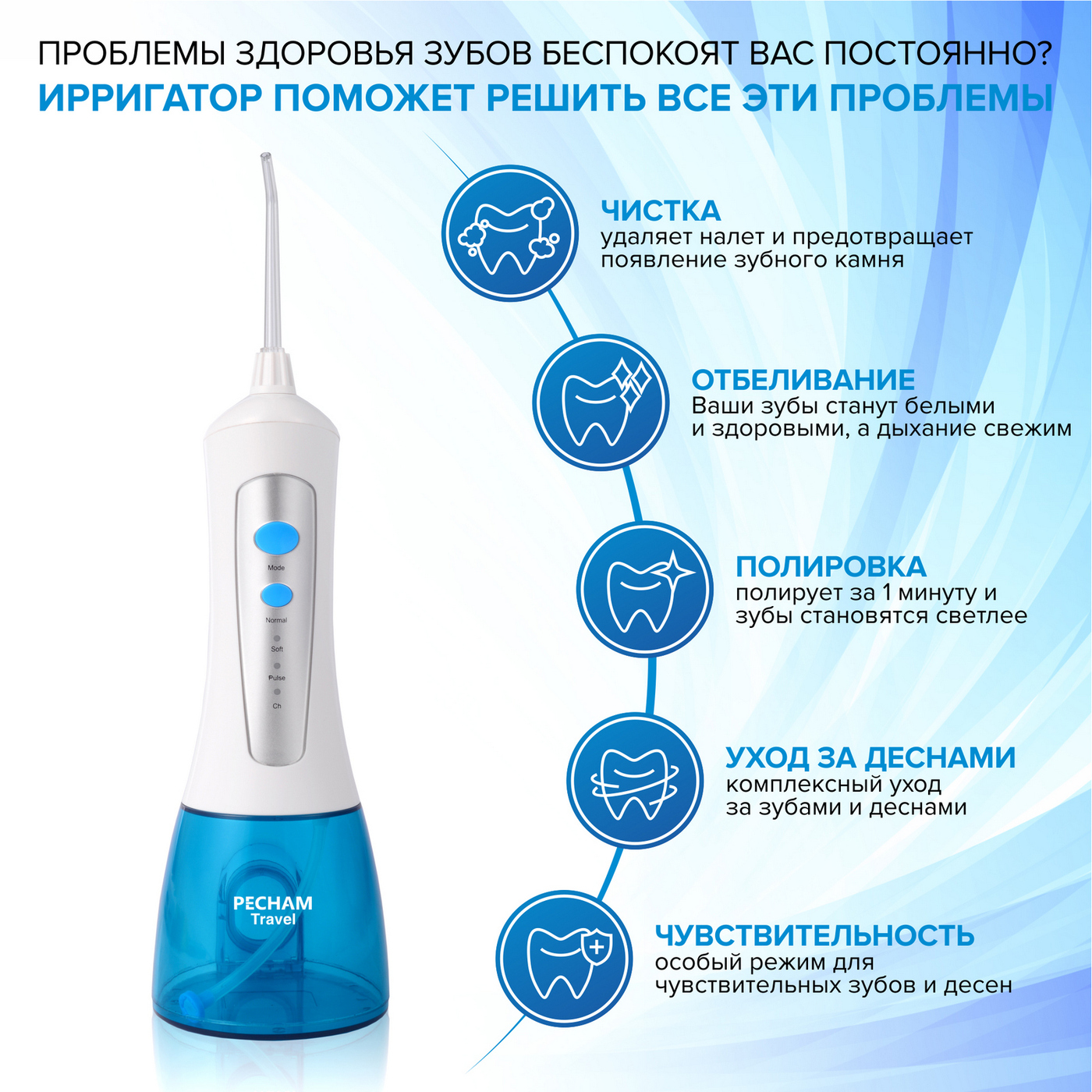 Ирригатор для полости рта Pecham Trip, Портативный, 5 насадок, Емкость 200 мл.