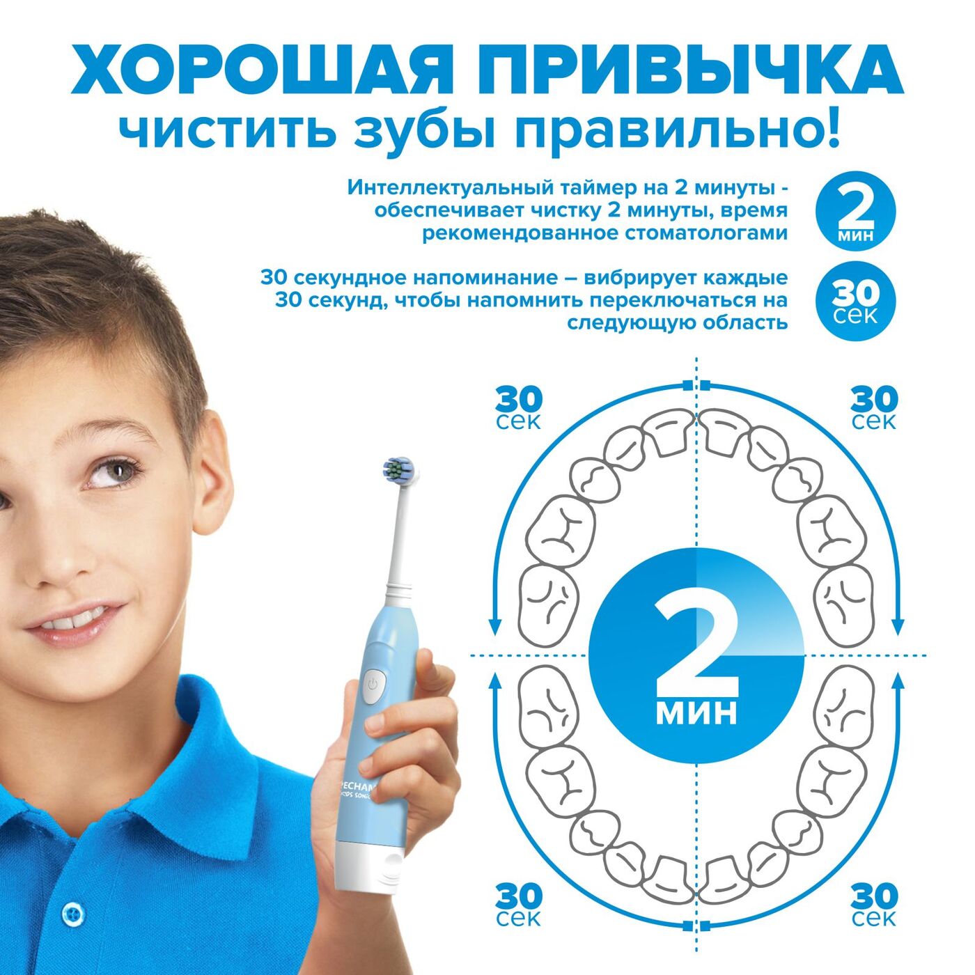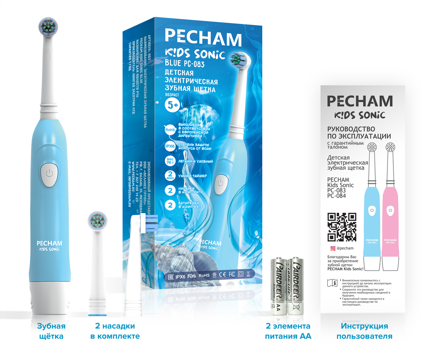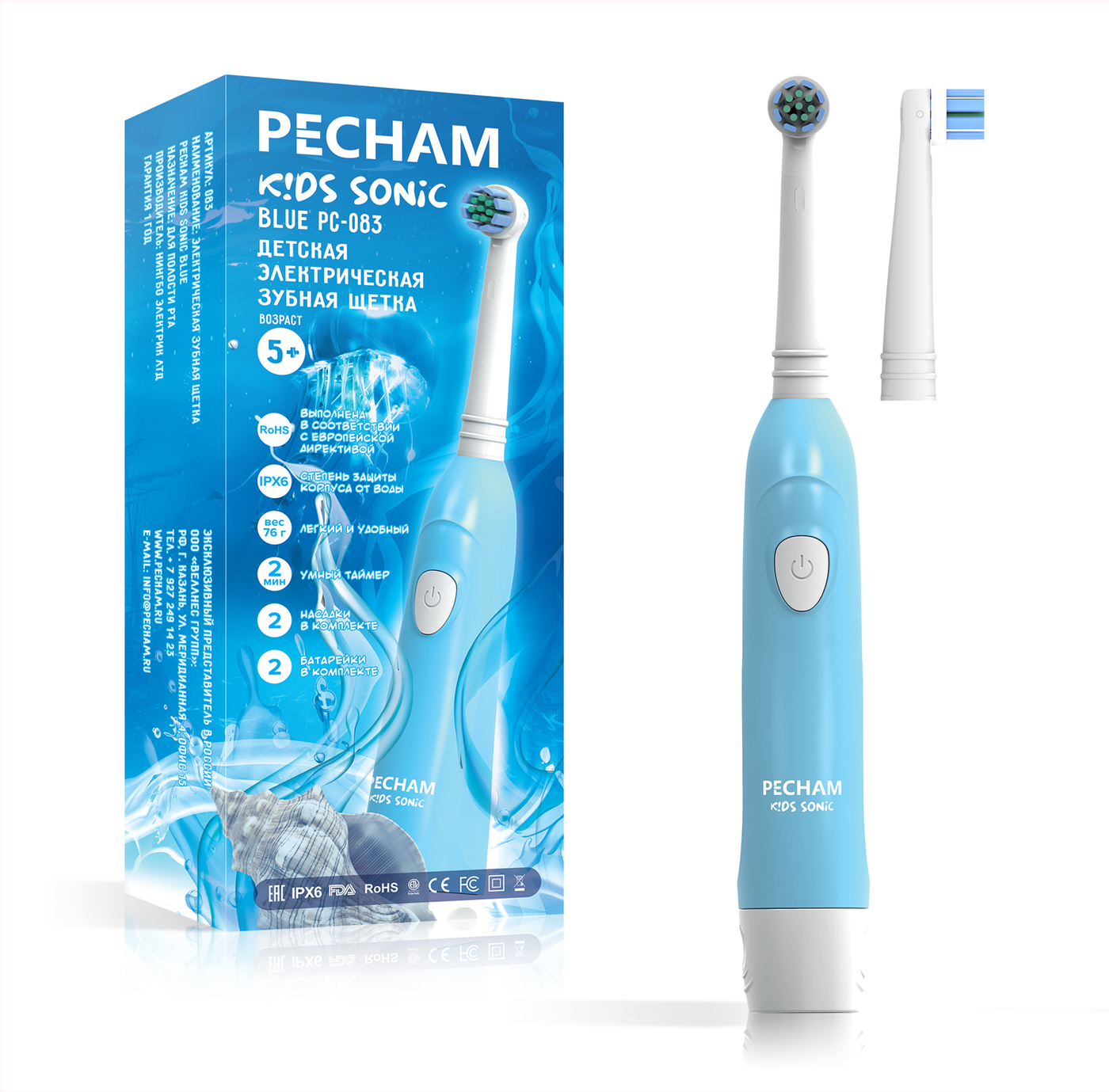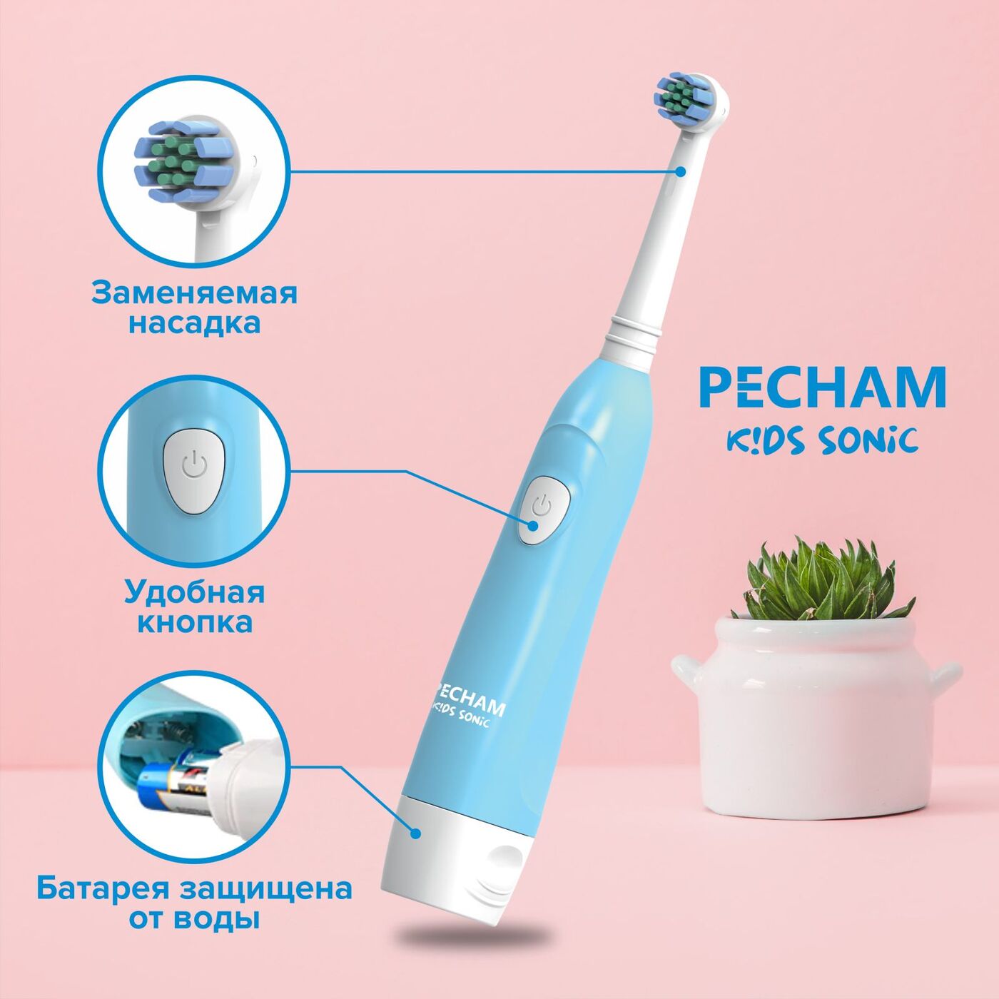 Электрическая зубная щетка PECHAM детская Kids Sonic 5+, 2 насадки, 2 батарейки АА , голубой