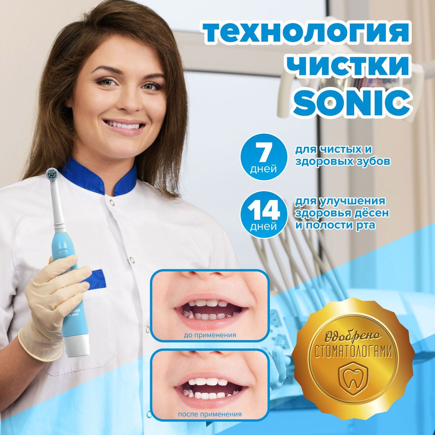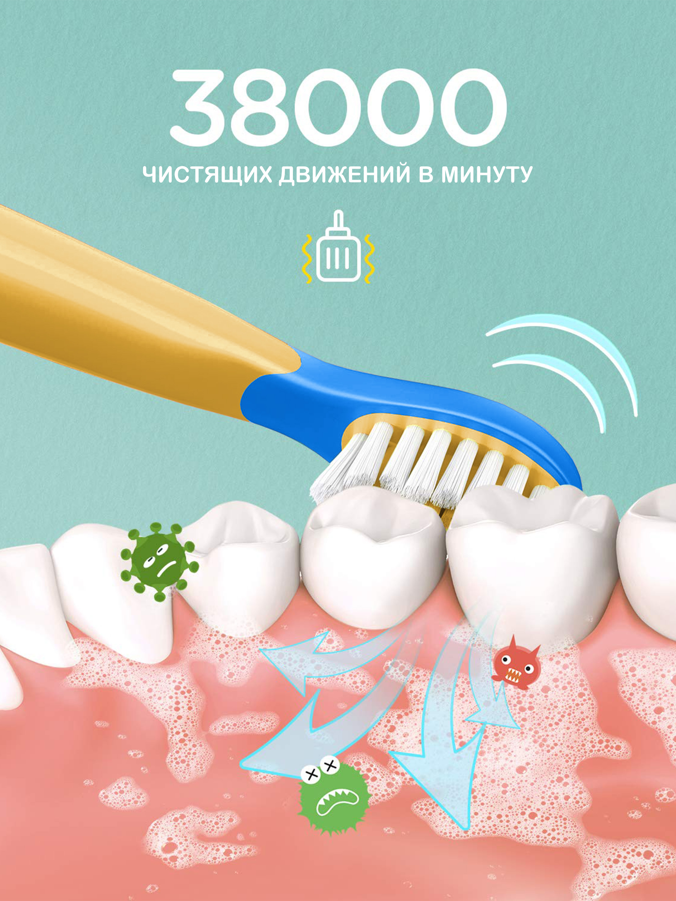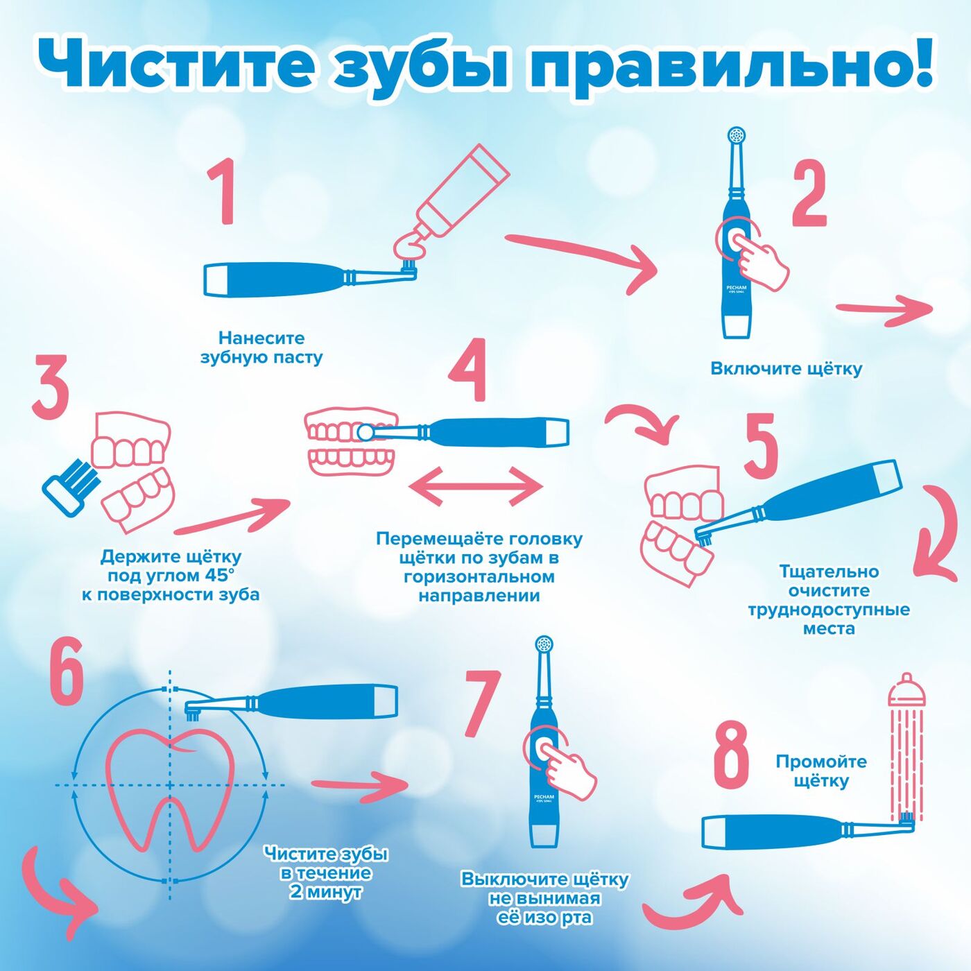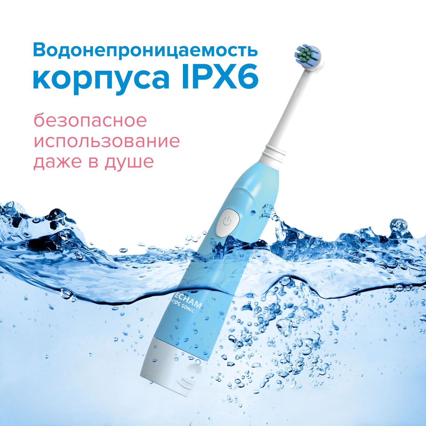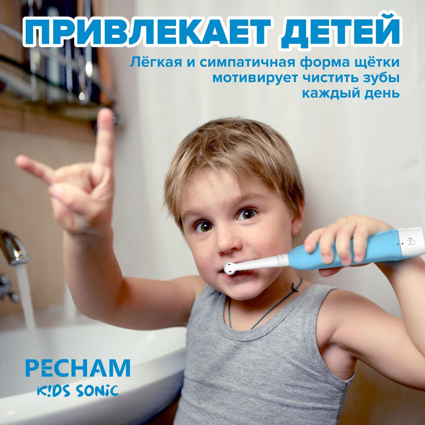 Электрическая зубная щетка PECHAM детская Kids Sonic 5+, 2 насадки, 2 батарейки АА , голубой
