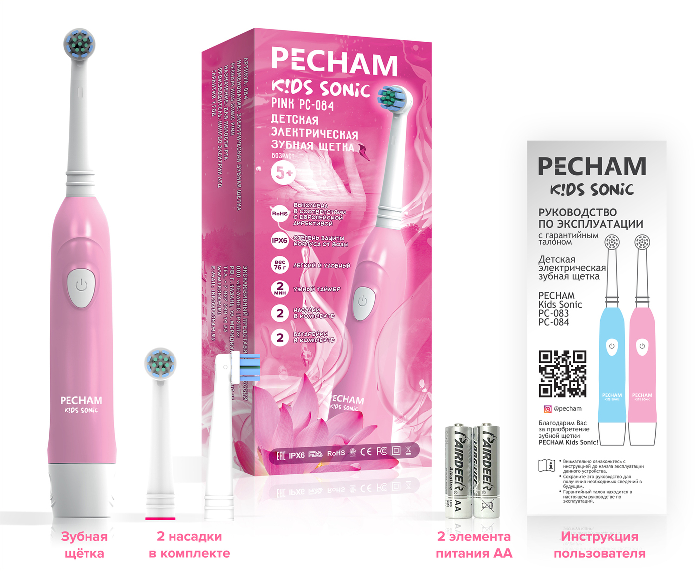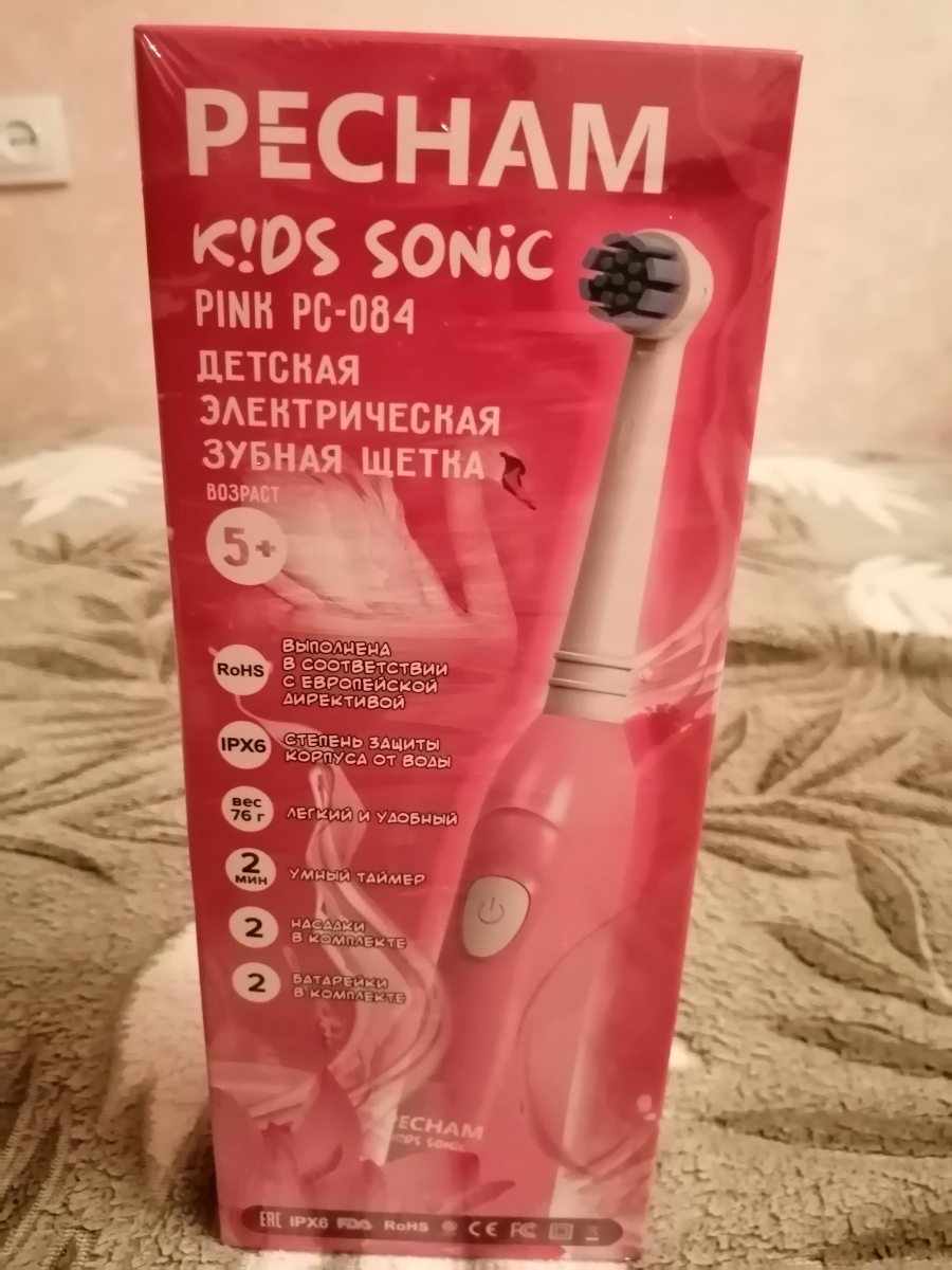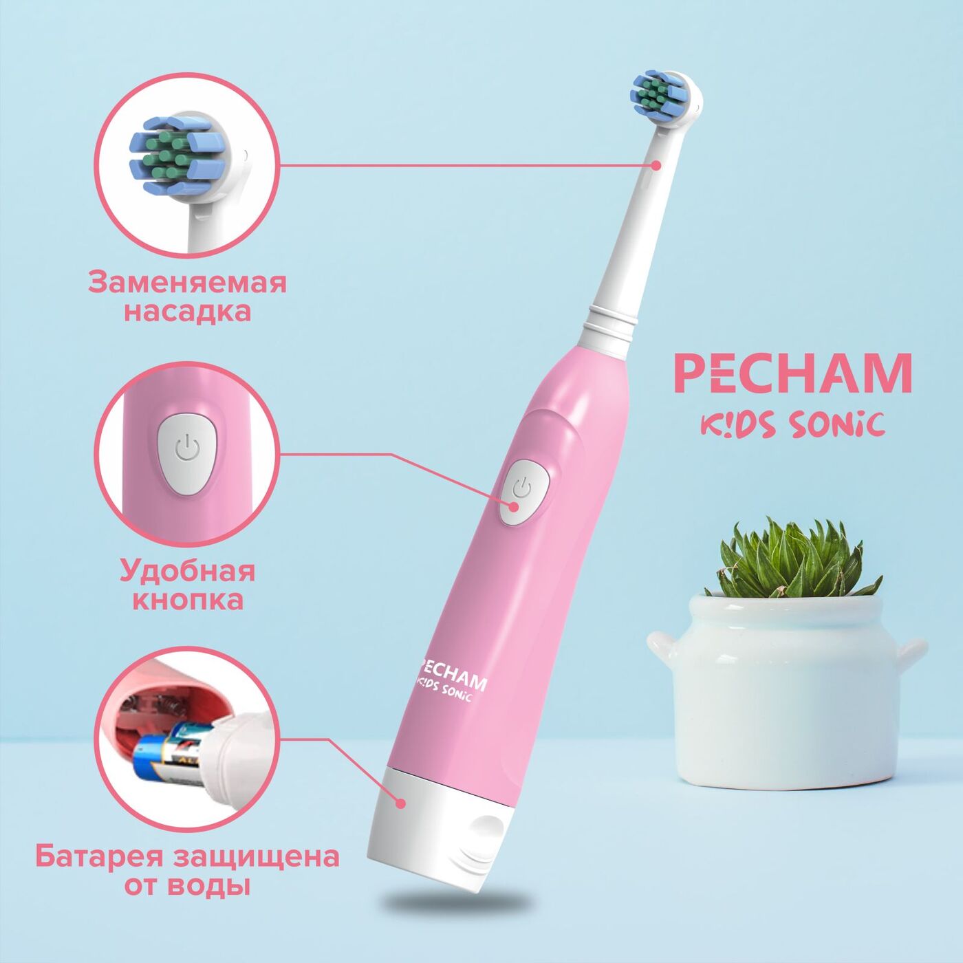 Электрическая зубная щетка PECHAM детская Kids Sonic 5+, 2 насадки, 2 батарейки АА , розовый