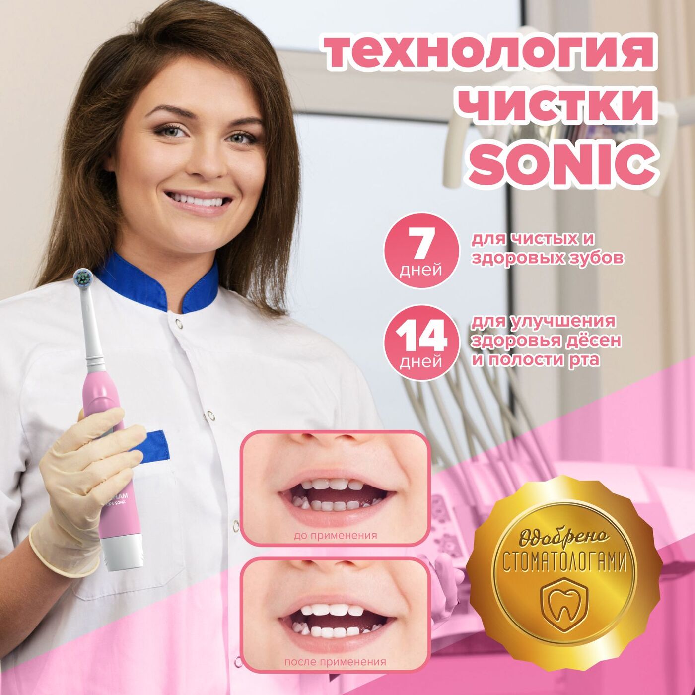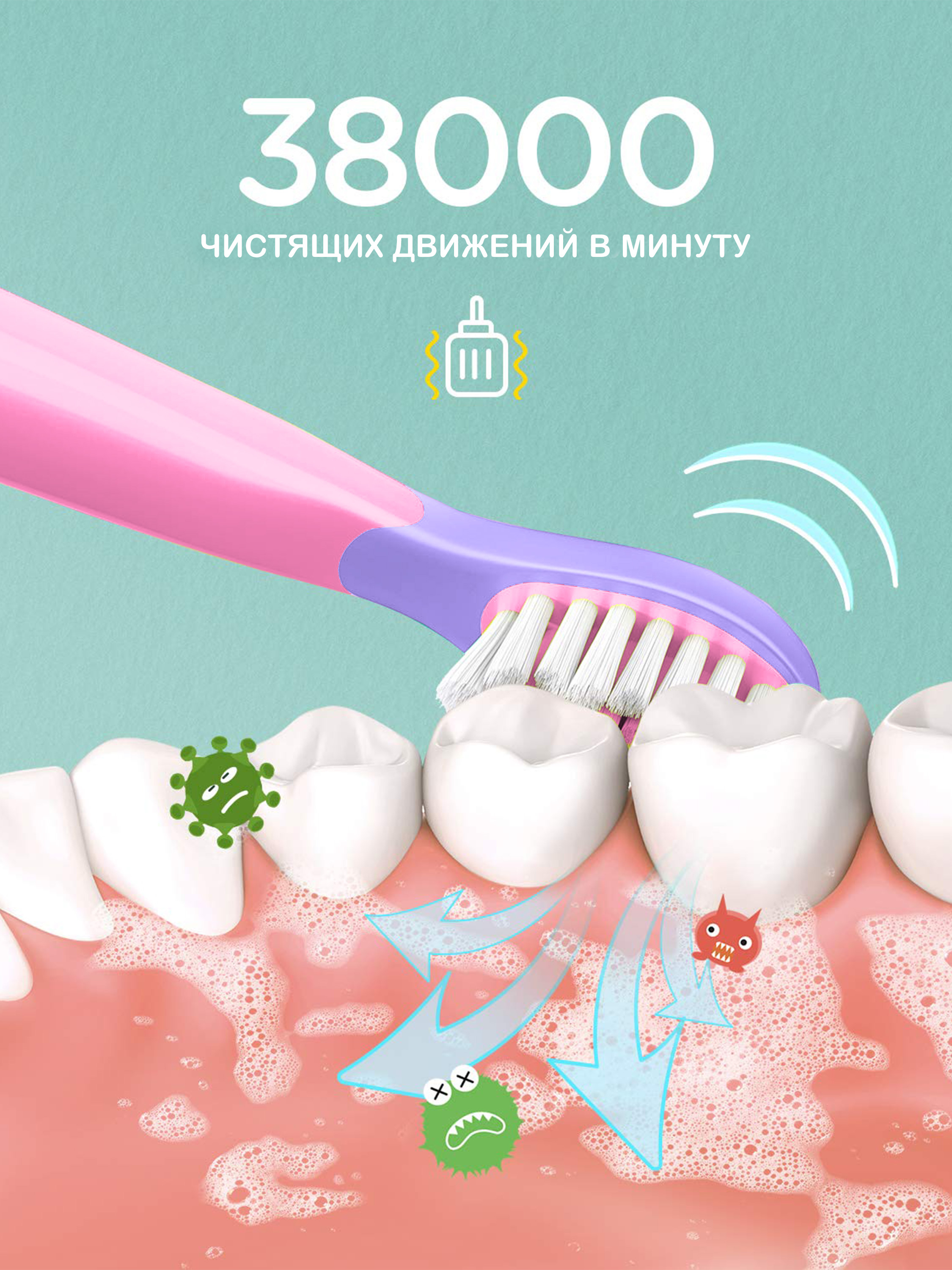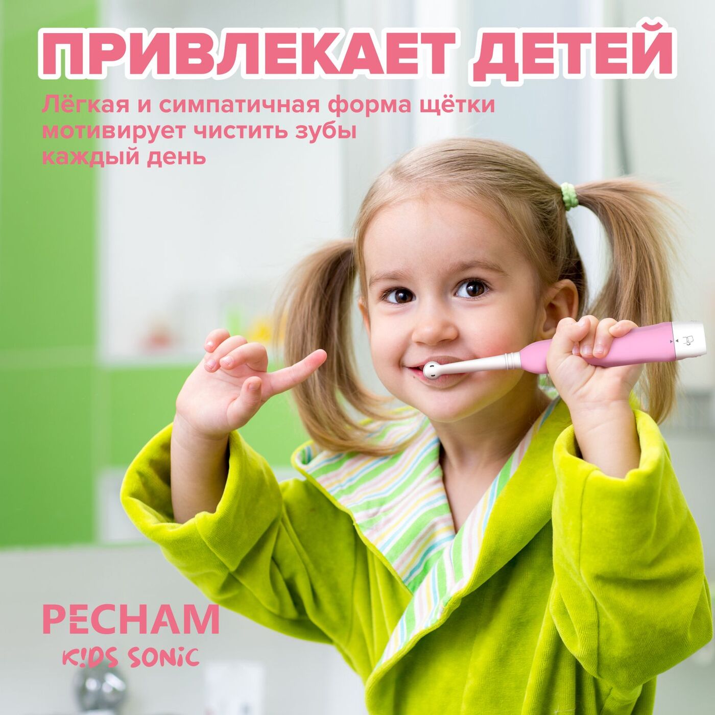Электрическая зубная щетка PECHAM детская Kids Sonic 5+, 2 насадки, 2 батарейки АА , розовый