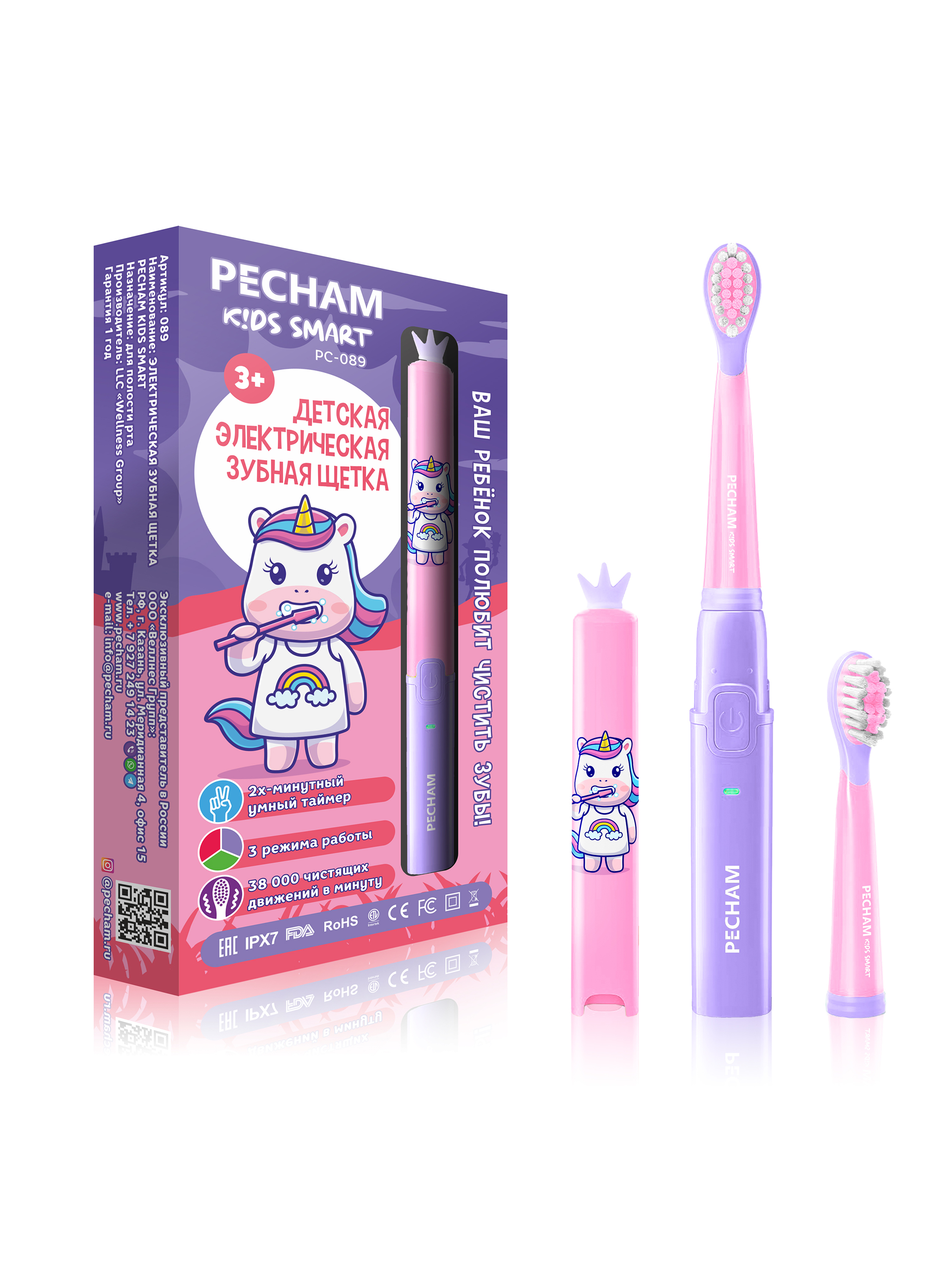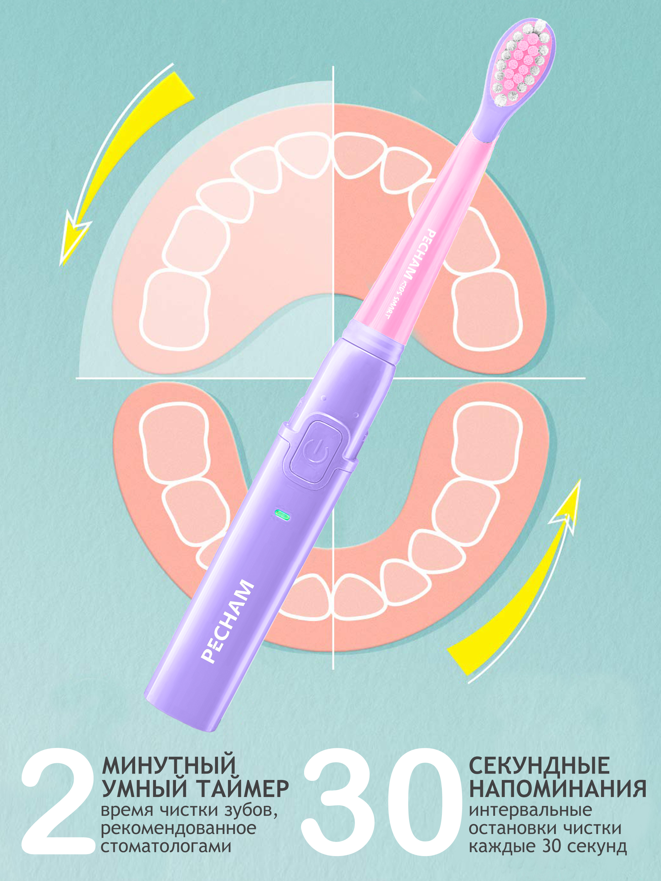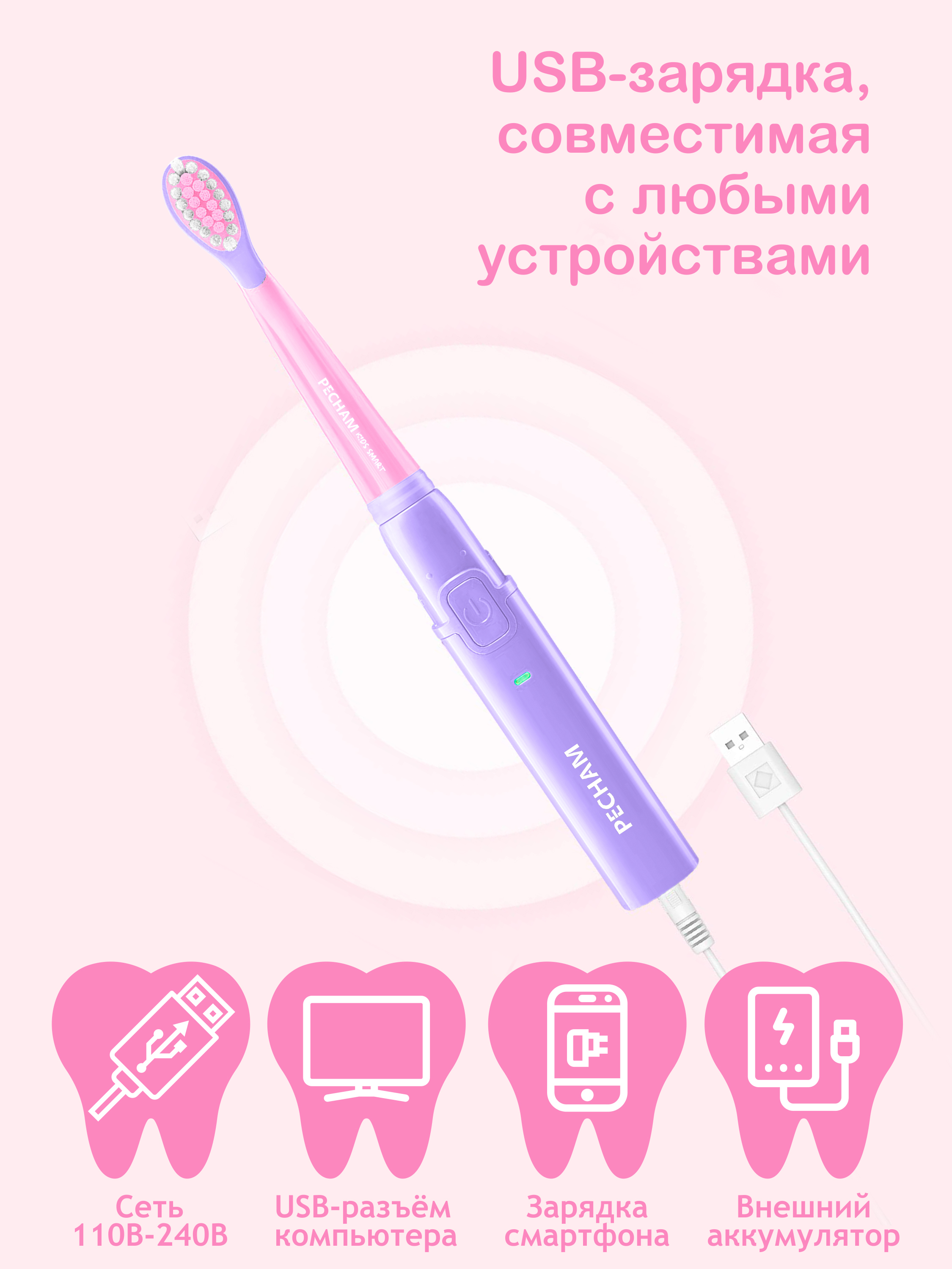 Электрическая зубная щетка PECHAM детская Kids Smart 3+, 2 насадки, Electric toothbrush , розовый