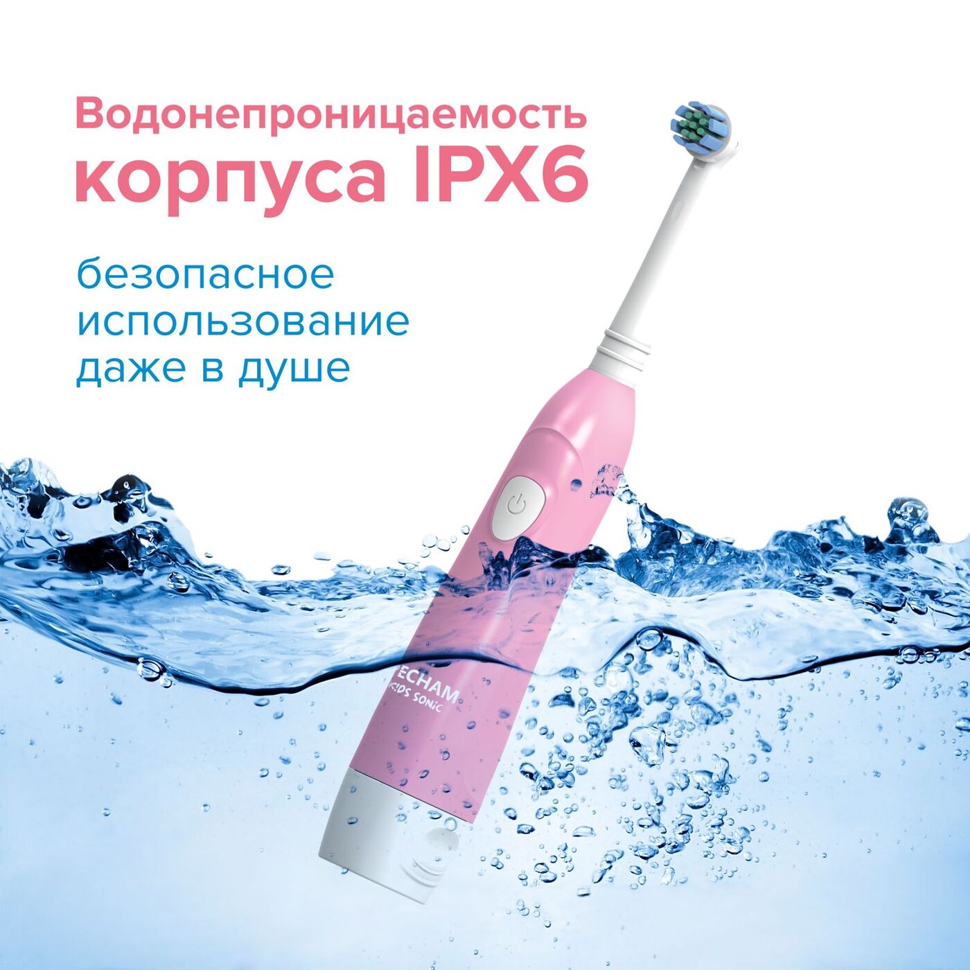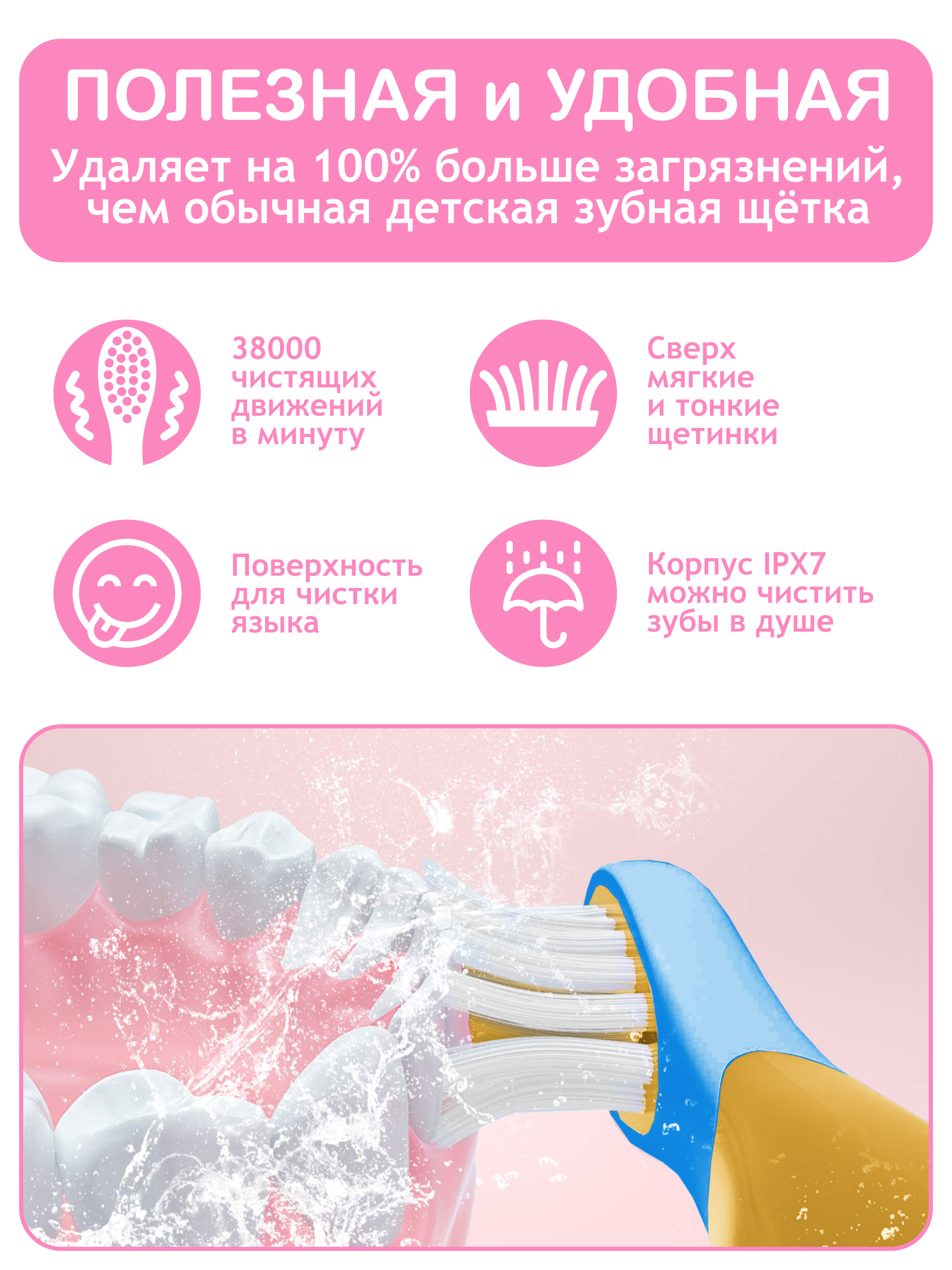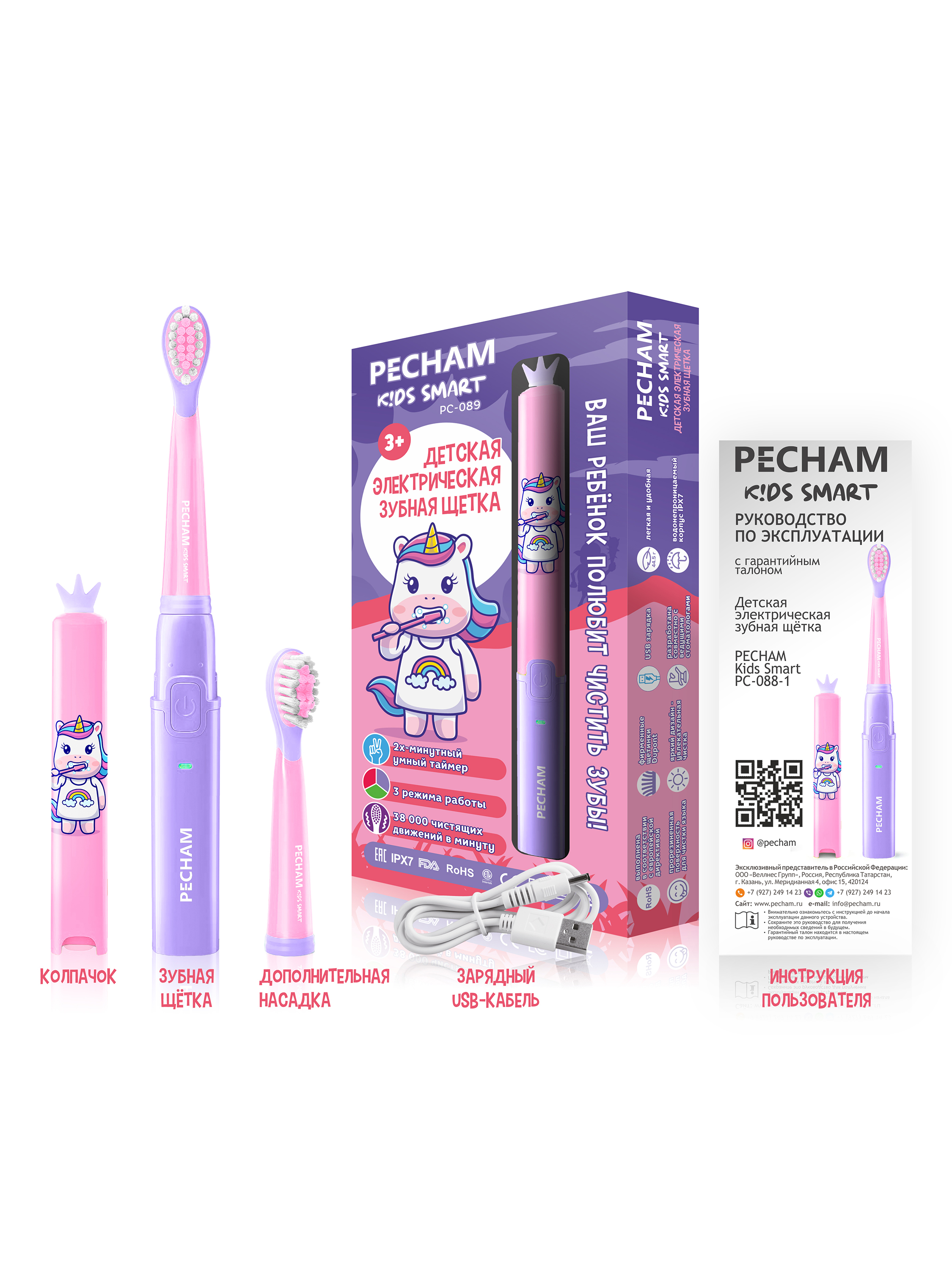 Электрическая зубная щетка PECHAM детская Kids Smart 3+, 2 насадки, Electric toothbrush , розовый