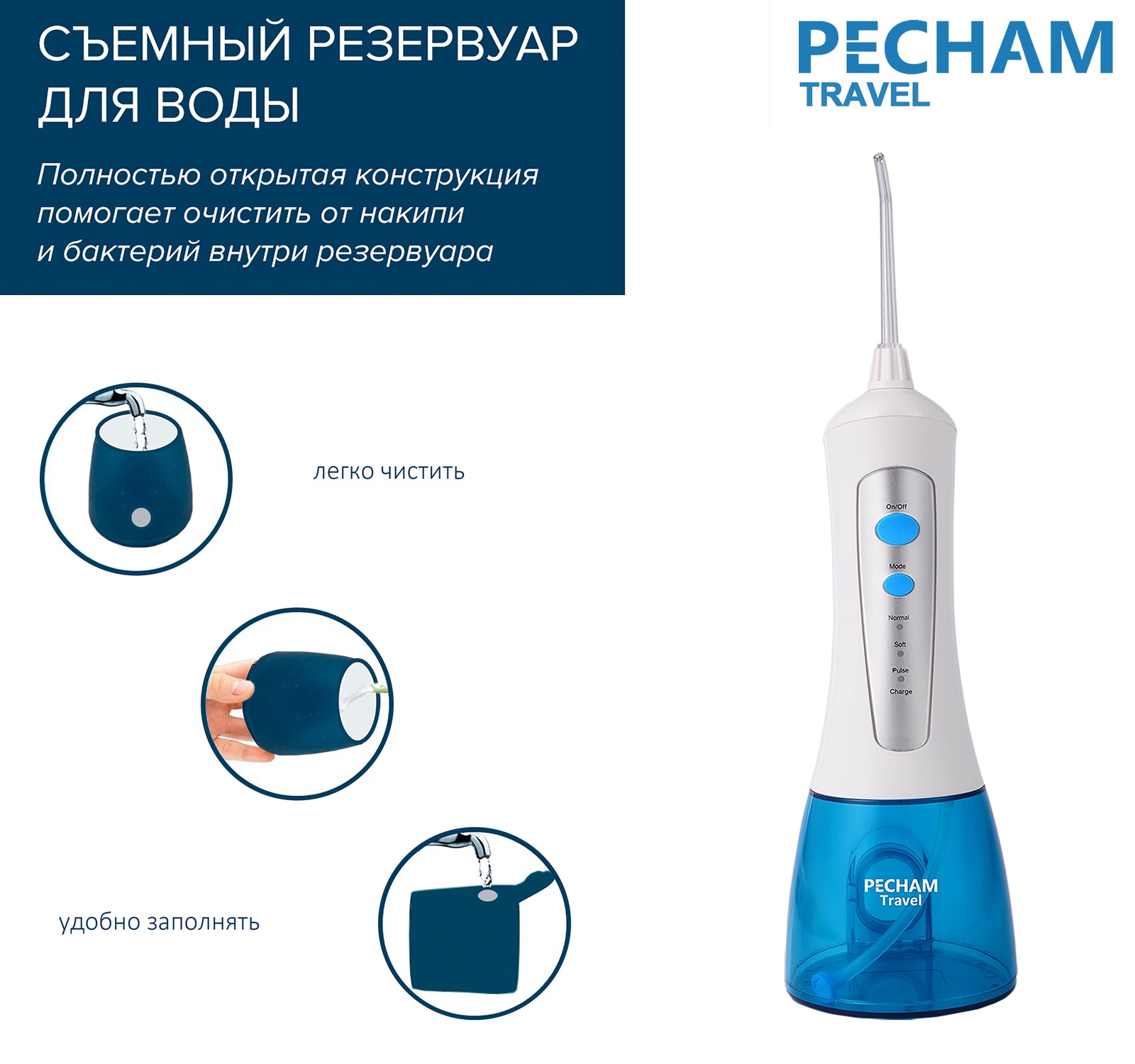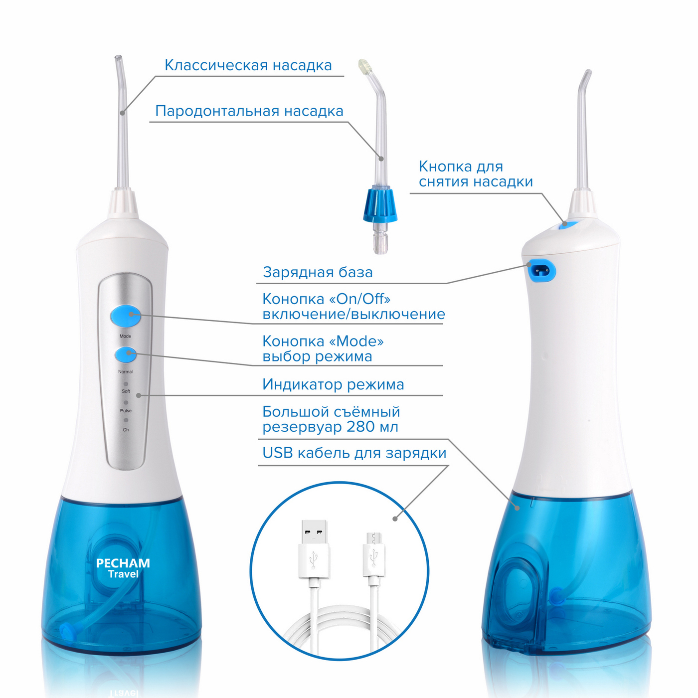 Ирригатор Pecham Travel, портативный, 2 насадки, емкость 280 мл
