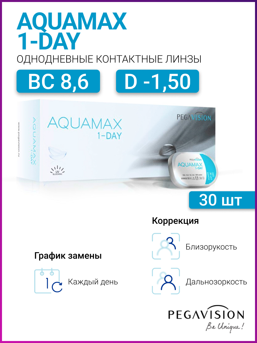 PEGAVISION Контактные линзы Aquamax 1 day Vita (30 линз) R 8.6, 30 шт., -1.50 / 8.6/ 1 день