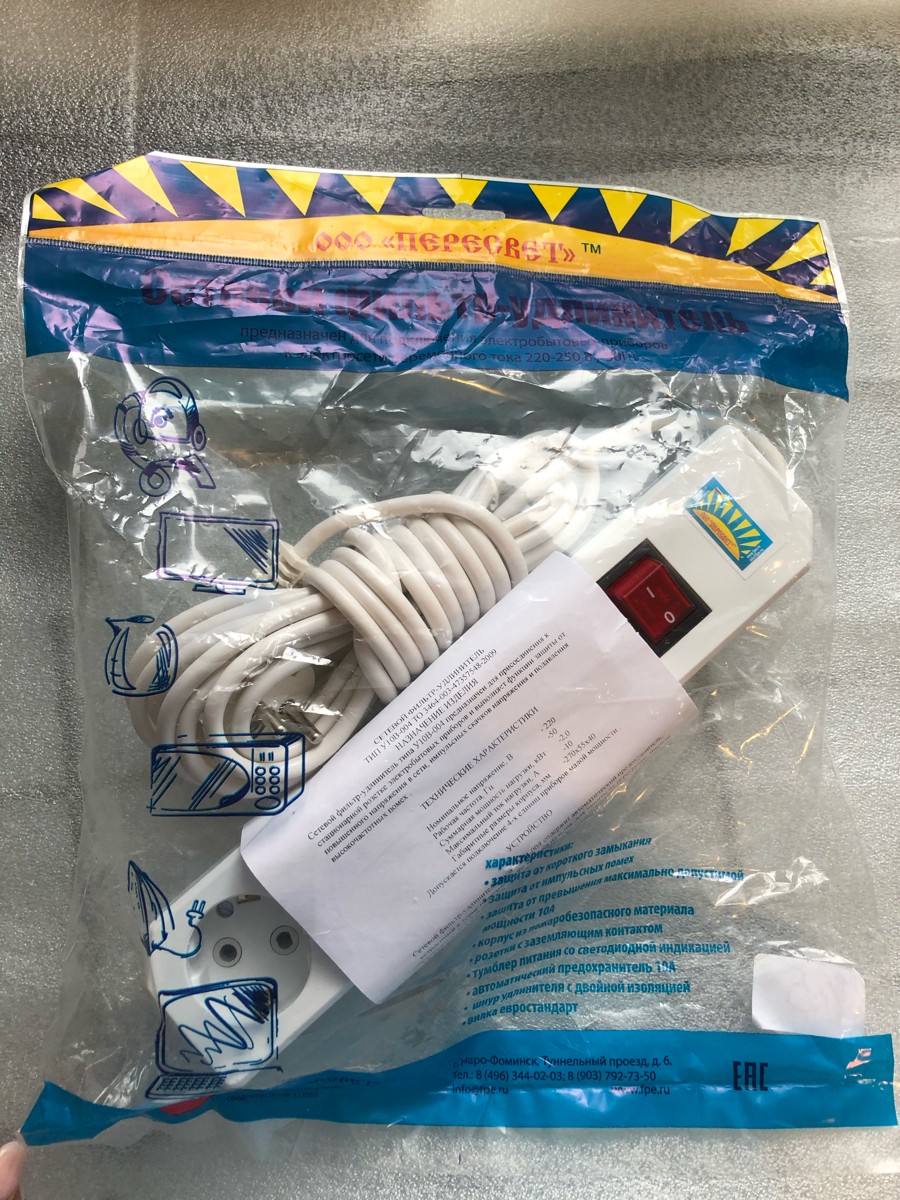 Удлинитель сетевой с заземлением, 3 гнезда с переключателем, шнур ПВС 3х0,75, 2 м