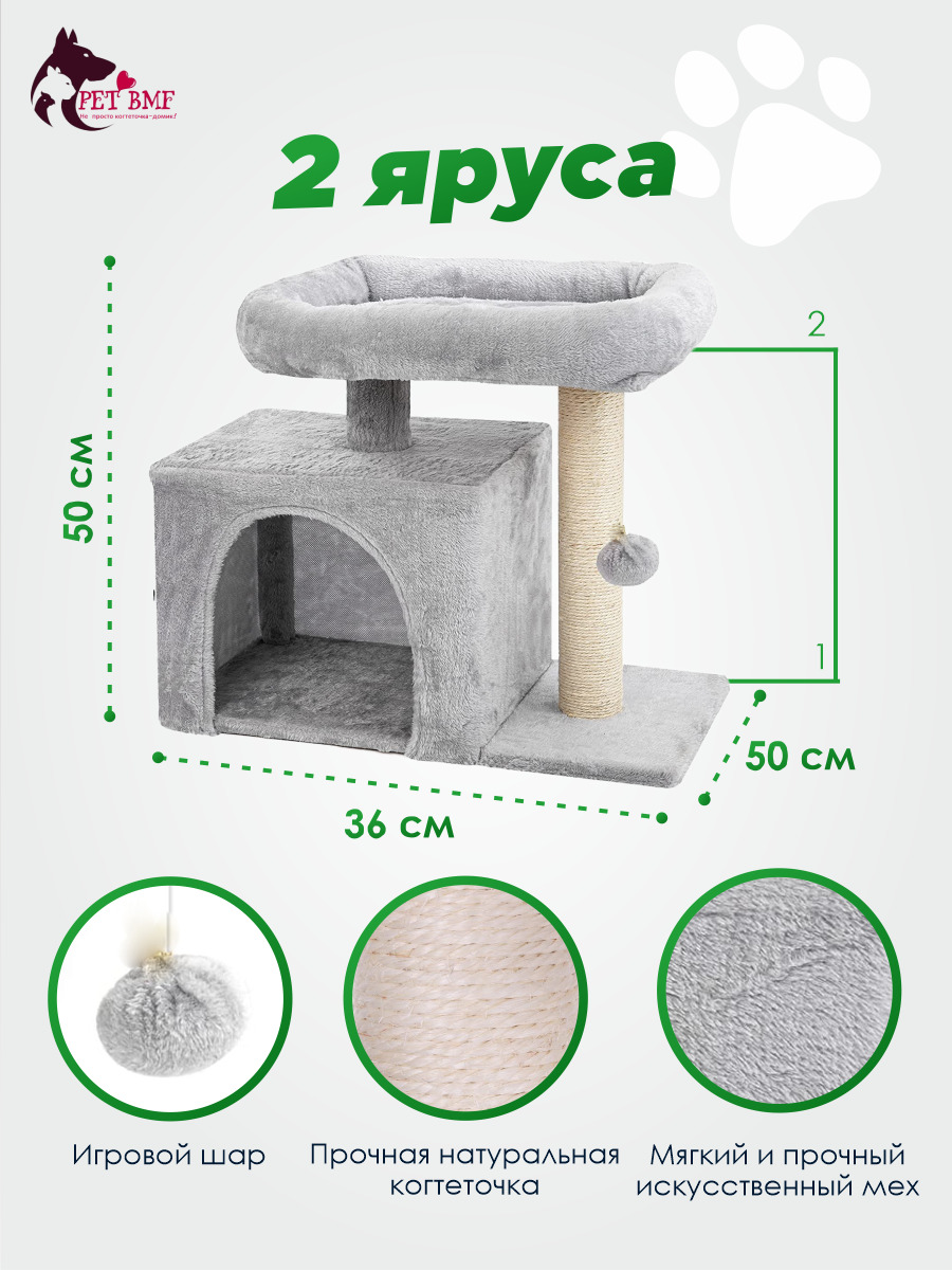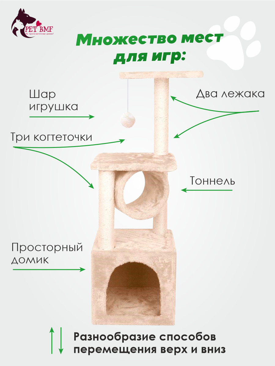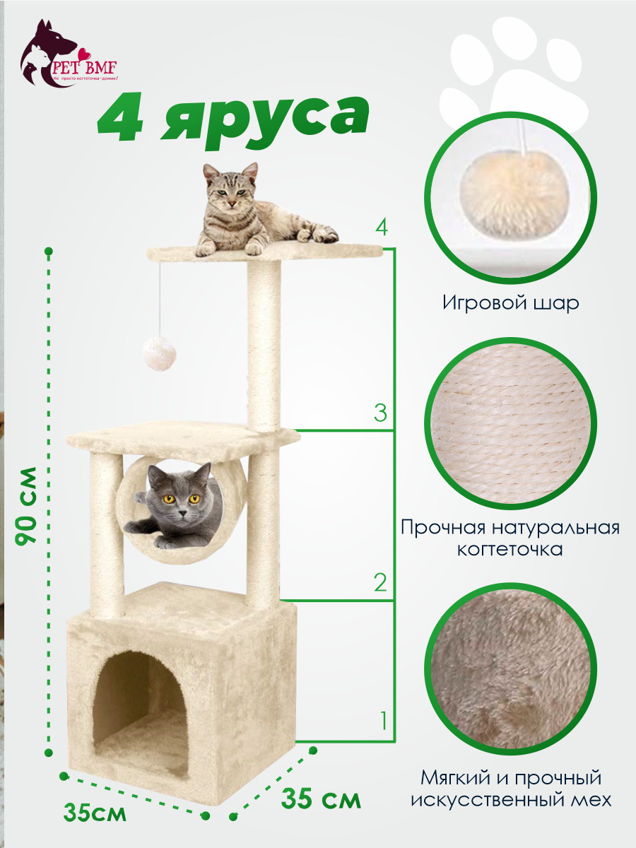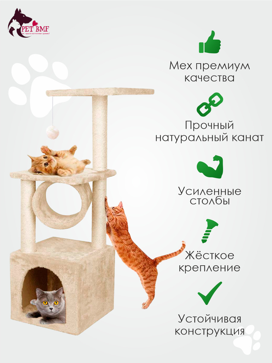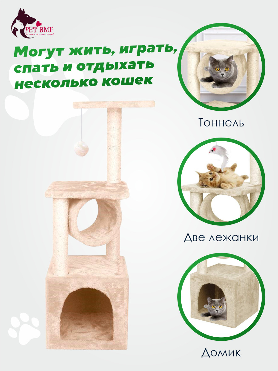 Домик когтеточка Pet БМФ для кошки, 35х35х62 см, сизалевый, с лежаком, с игрушкой бежевый