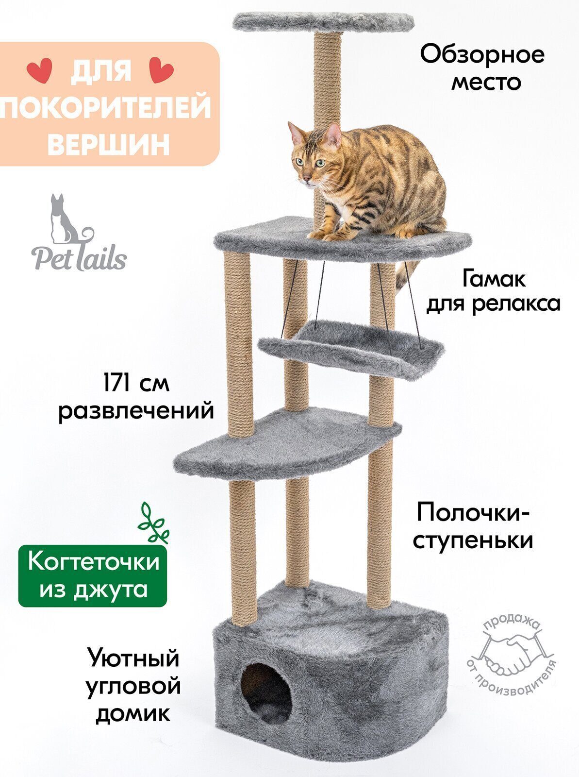 Когтеточка домик для кошек "PetTails" Башня угловая с гамаком, серый 48 х 48 х 171 см (джут беленый)
