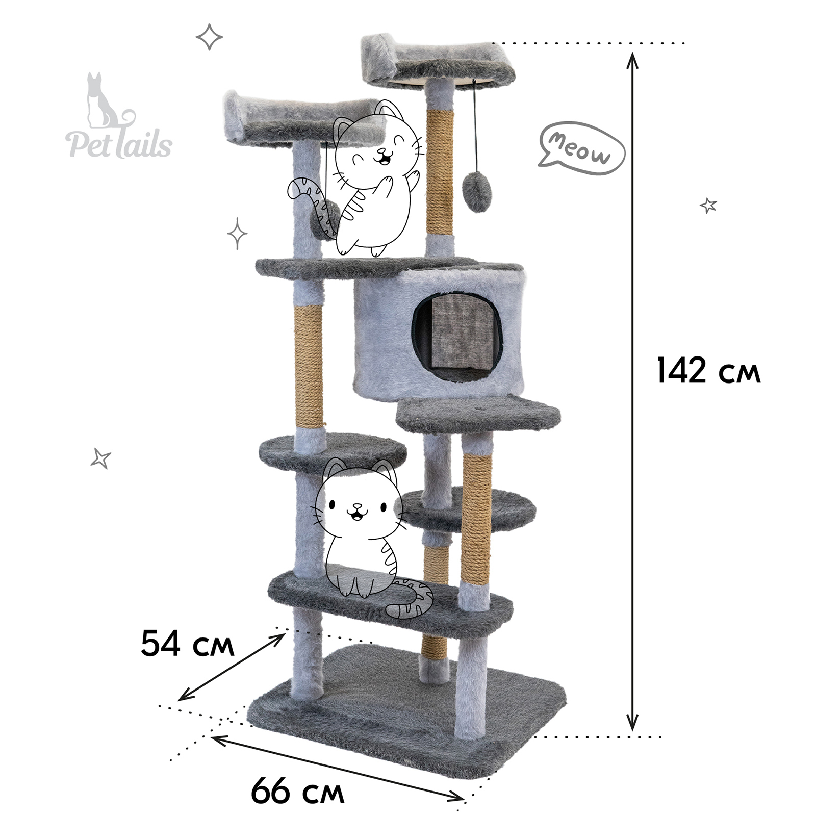 Когтеточка домик "PetTails" ДЕНИС разборный, 5ти уровн., 54 х 66 х h142см (мех, джут) серый