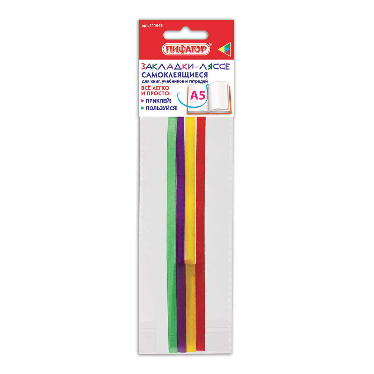 Закладки-ляссе Радуга для книг А5 (длина 28 см) Пифагор, клейкий край, 4 ленты