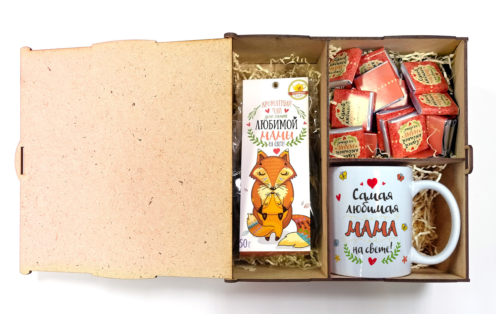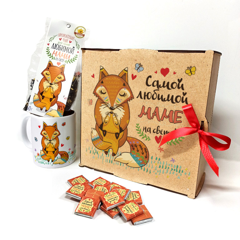 Самой любимой маме, деревянный короб с чаем, шоколадом и кружкой