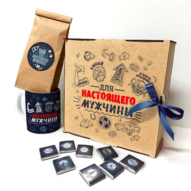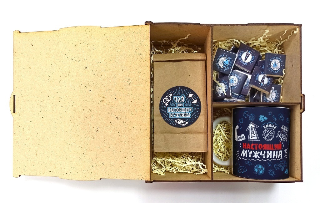 Для настоящего мужчины, деревянный короб с чаем, шоколадом и кружкой