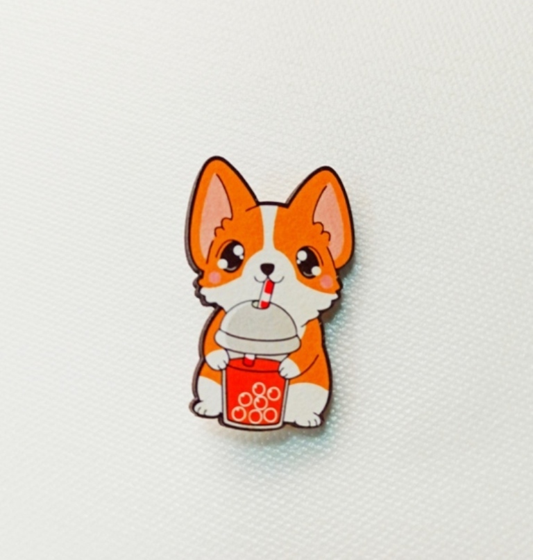 Деревянный значок (брошь) "Корги с соком" Подариссимо