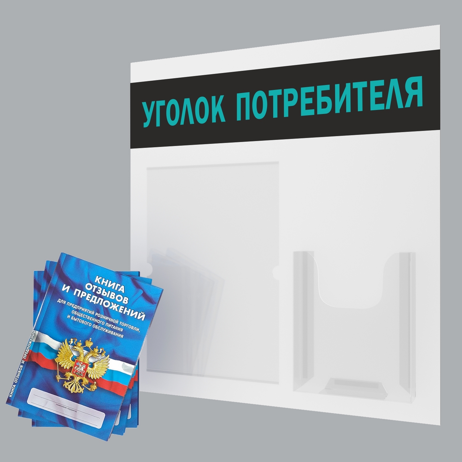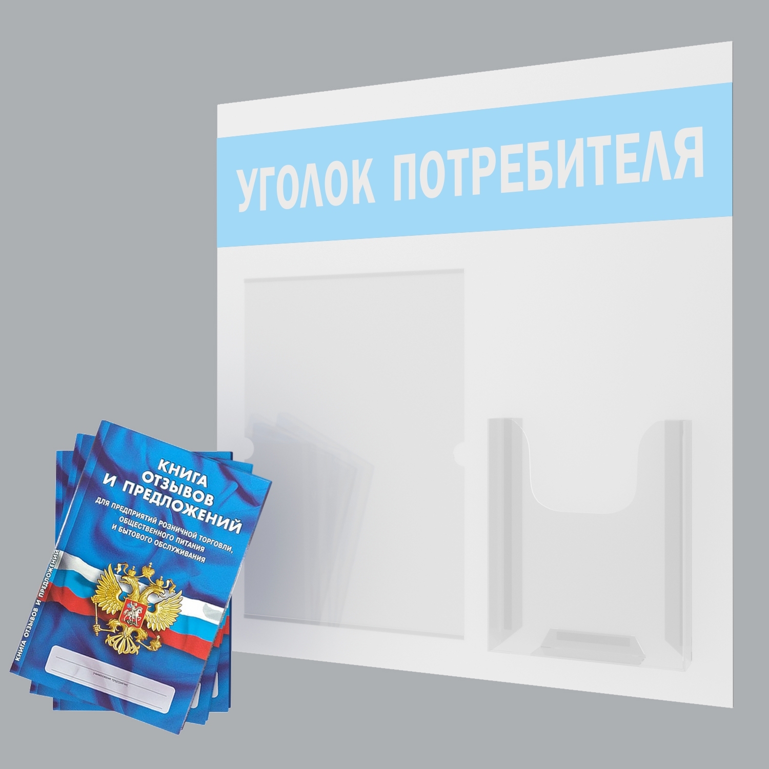 Уголок потребителя + комплект книг 2021 года (3 шт). Информационный стенд для ИП и ООО с карманами: А4 плоский - 1 шт, А5 объемный - 1 шт. Цвет: Белый; Голубой. ПолиЦентр