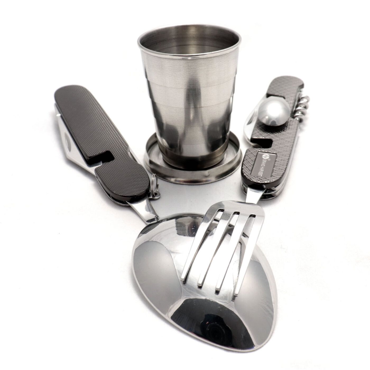 Комплект: набор походный столовый, 7 предметов + складной стакан (70мл)