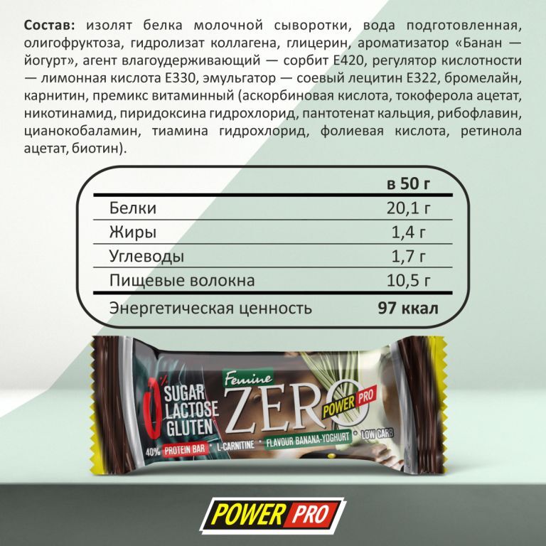 POWER PRO Zero Протеиновый батончик без сахара со вкусом банан-йогурт, 50 г (х20)