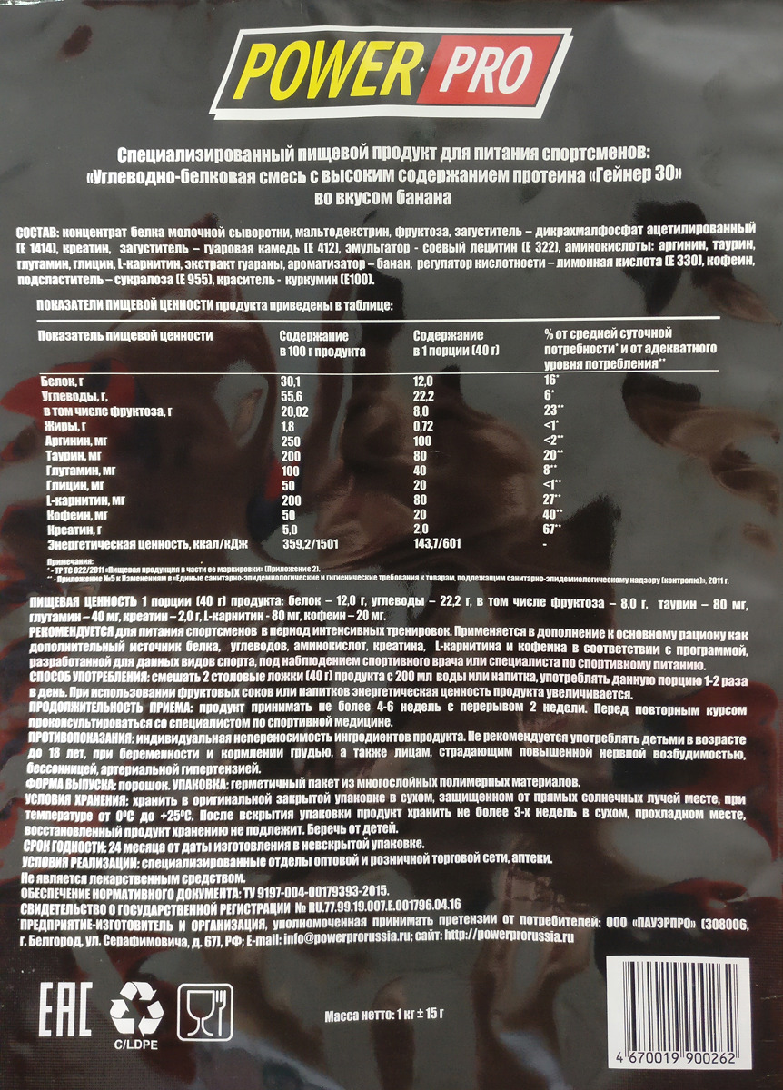 Гейнер Power Pro Gainer 30 со вкусом банана, 1 кг