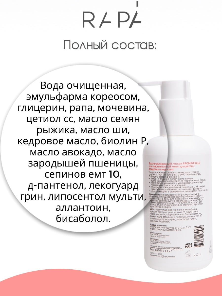 RAPA Восстанавливающий лосьон PROMINERALS для чувствительной кожи 0+, 250 мл