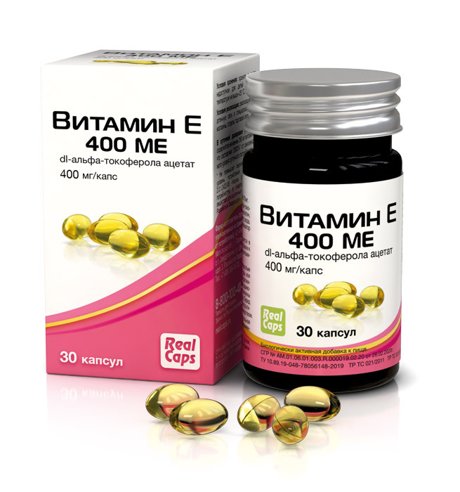 Real Caps, Витамин Е, dl-альфа-токоферола ацетат, 400 МЕ, 30 капсул, 570 мг