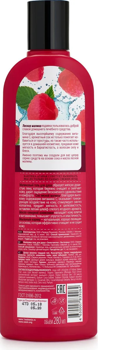 Рецепты бабушки Агафьи гель для душа смягчающий Малиновый, 280 мл