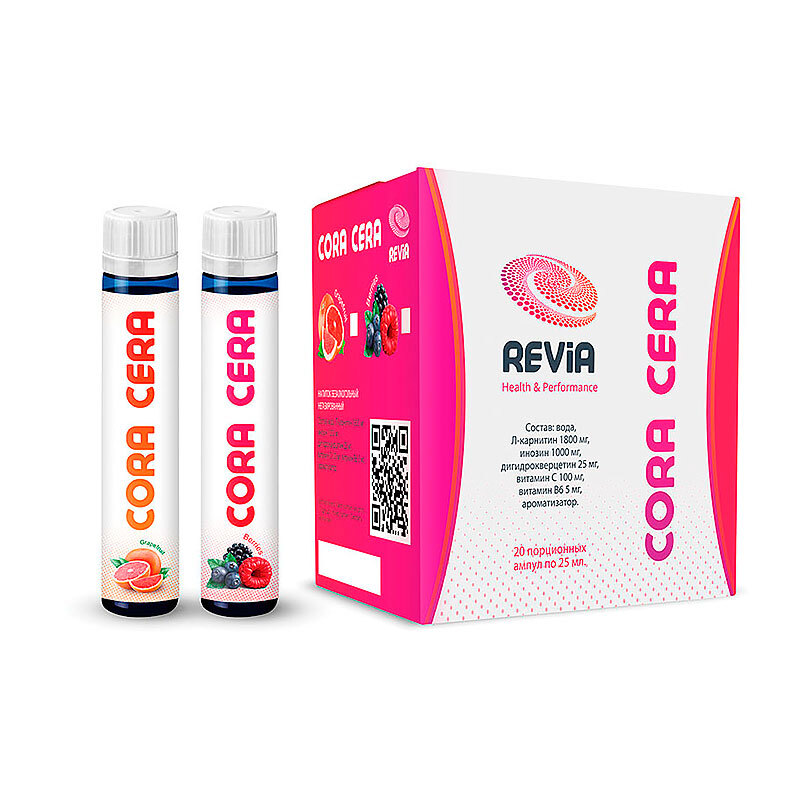 Шоубокс 20 амп по 25 мл - Для сердца Л-карнитин Инозин Дигидрокверцетин комплекс - Revia Cora Cera - со вкусом лесных ягод
