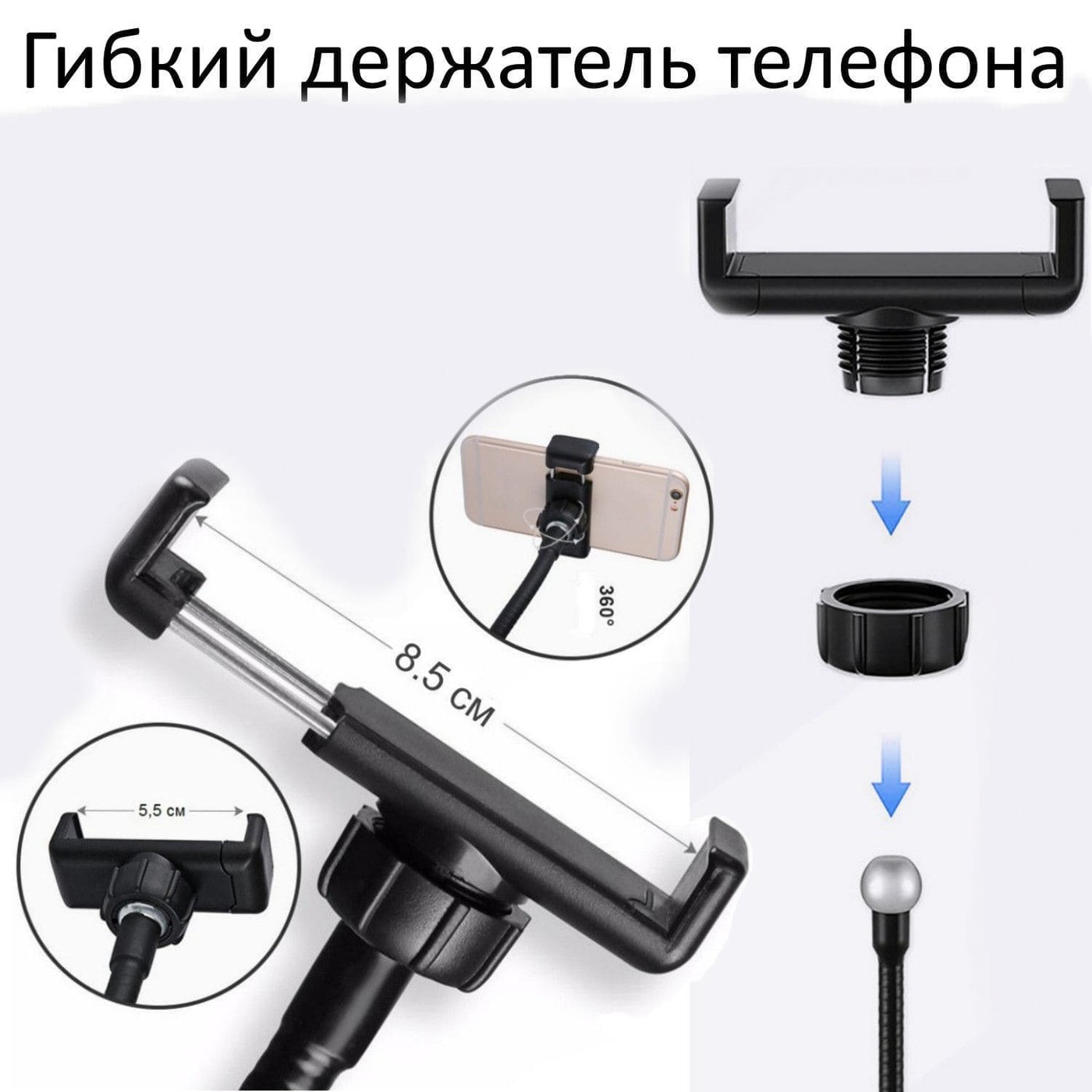 Гибкий короткий держатель телефона для кольцевой лампы, с внутренней резьбой, длина 13 см