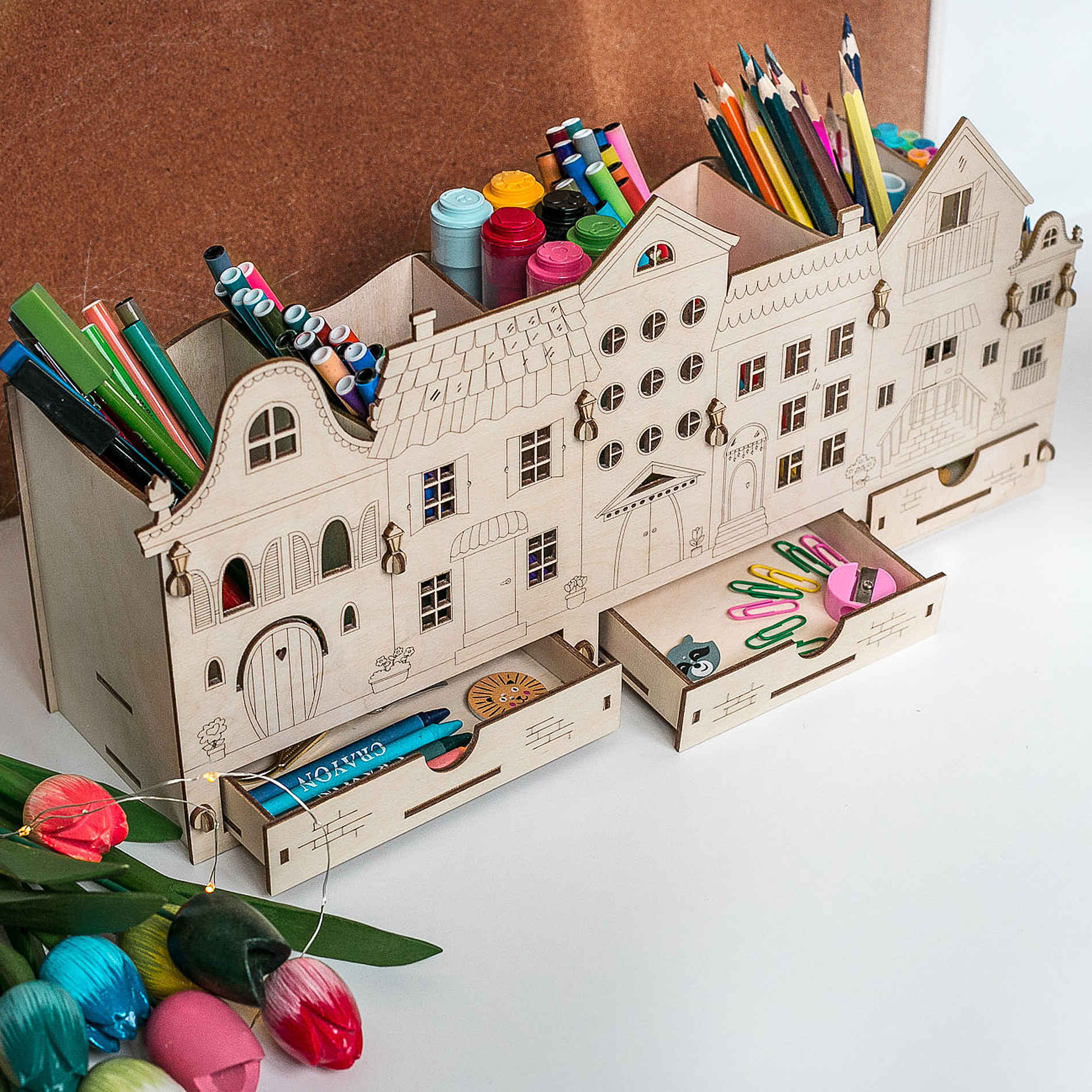 Органайзер канцелярский "Домики Амстердама" деревянный (фанера) подставка для карандашей и ручек