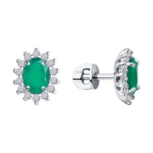 Роскошь Серьги пусеты серебро родированное 925 пробы, вставки - Агат зеленый, фианит
