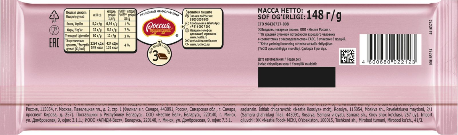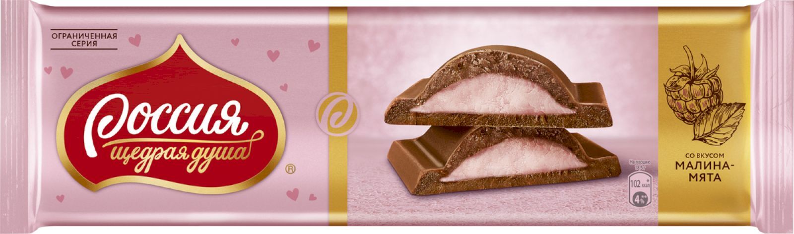 Молочный шоколад Россия-Щедрая душа! с начинкой со вкусом малины и мяты, 148 г