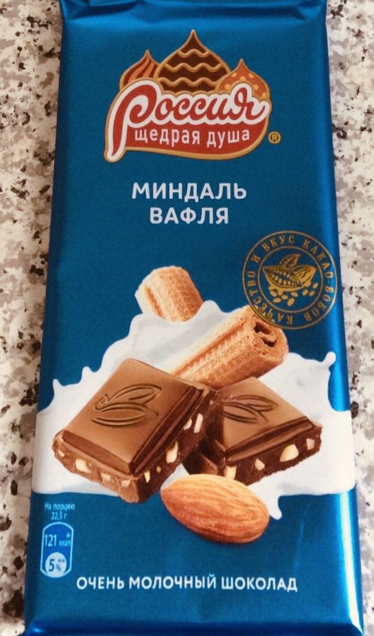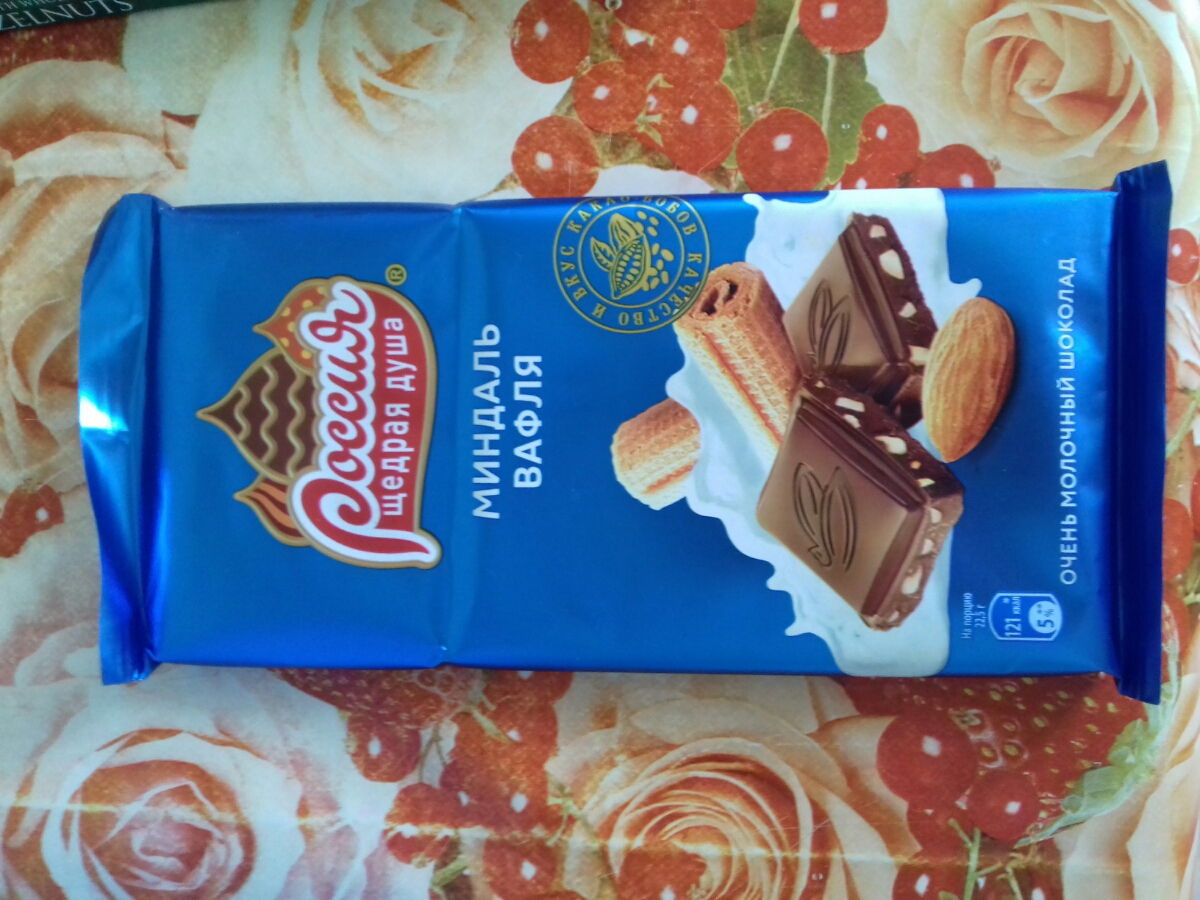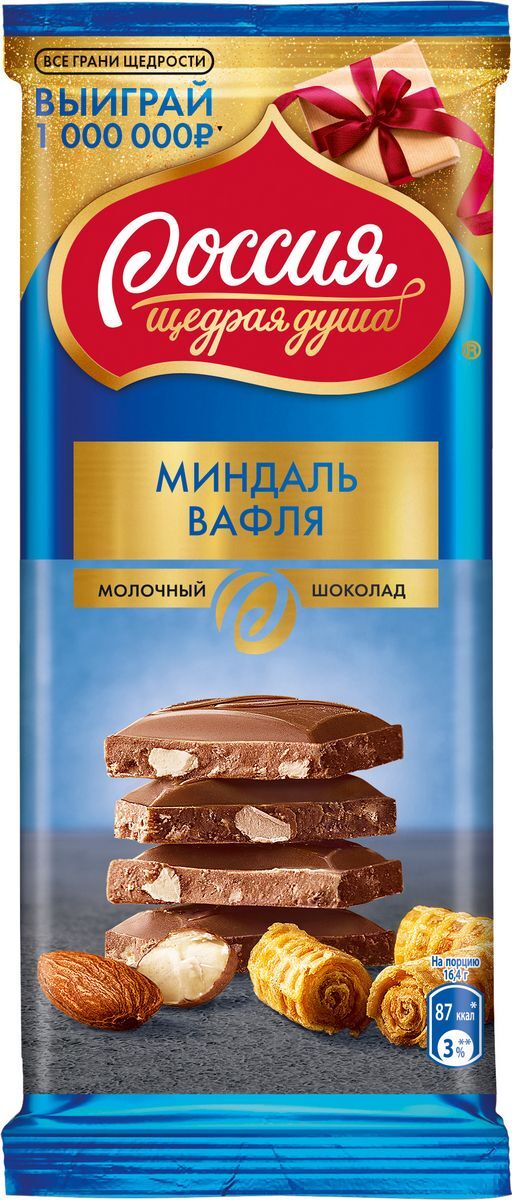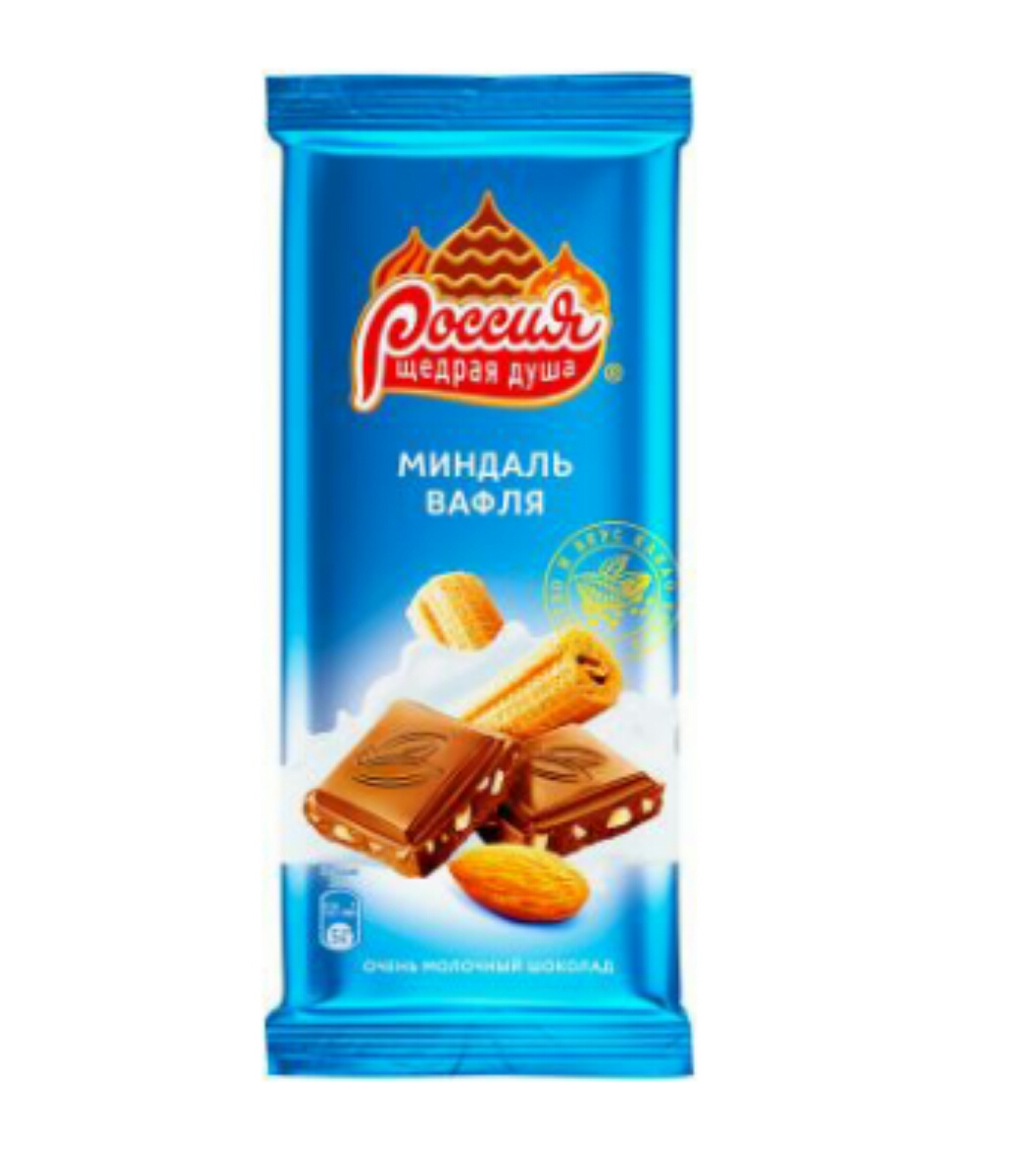 Шоколад Россия-Щедрая душа!, с миндалем и вафлей, 82 г