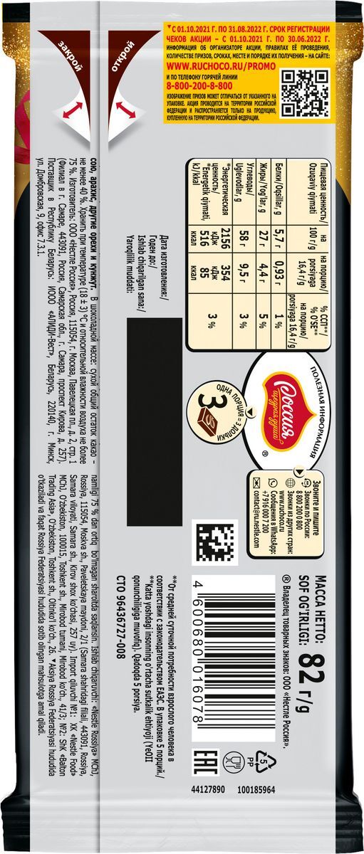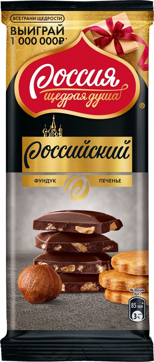 Шоколад Россия-Щедрая душа! Российский, с фундуком и печеньем, 82 г