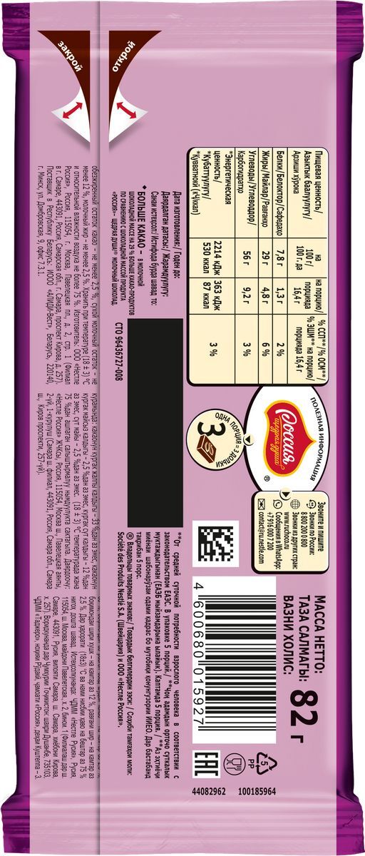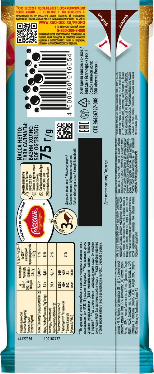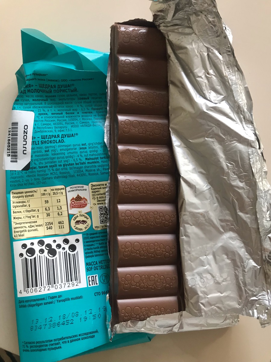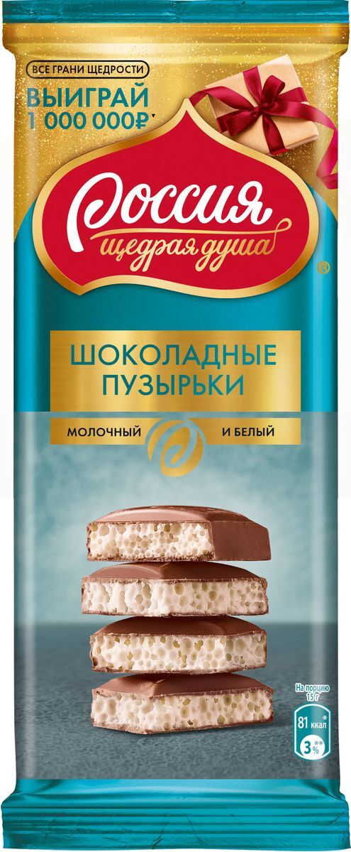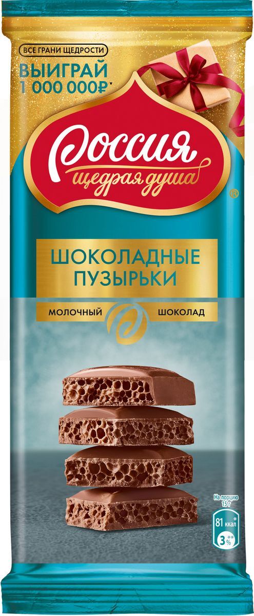 Шоколад Россия-Щедрая душа! Шоколадные пузырьки, молочный, пористый, 75 г