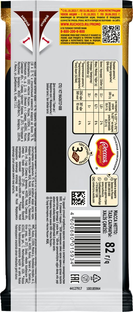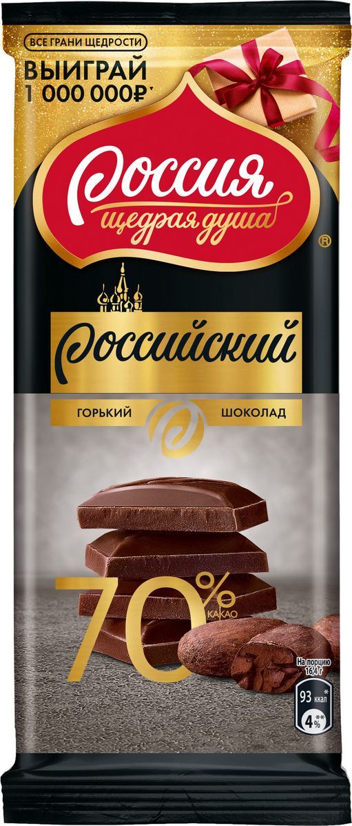 Горький шоколад РОССИЙСКИЙ с 70 % содержанием какао-продуктов, 82 г
