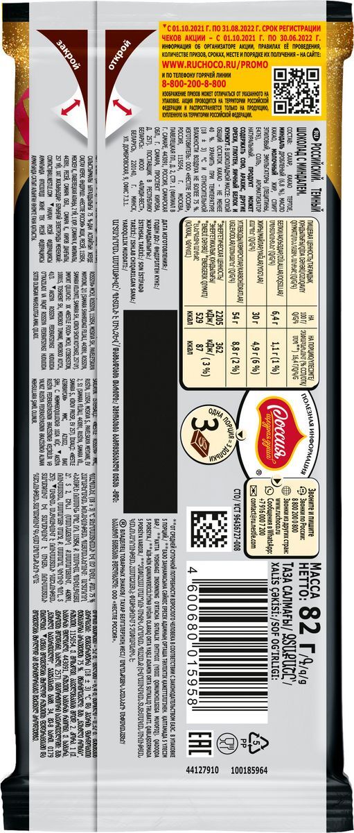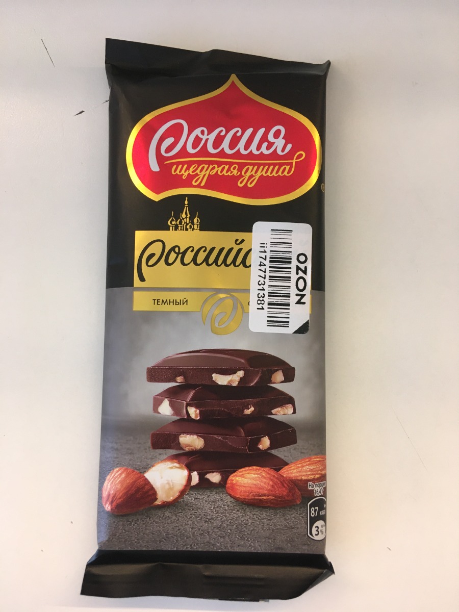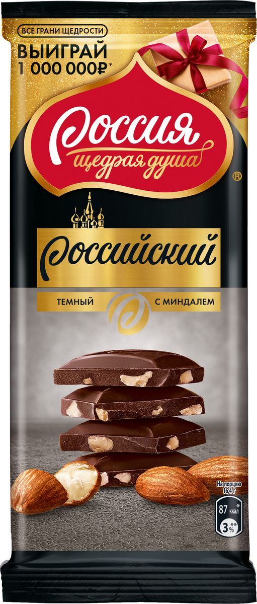 Темный шоколад РОССИЙСКИЙ с миндалем, 82 г