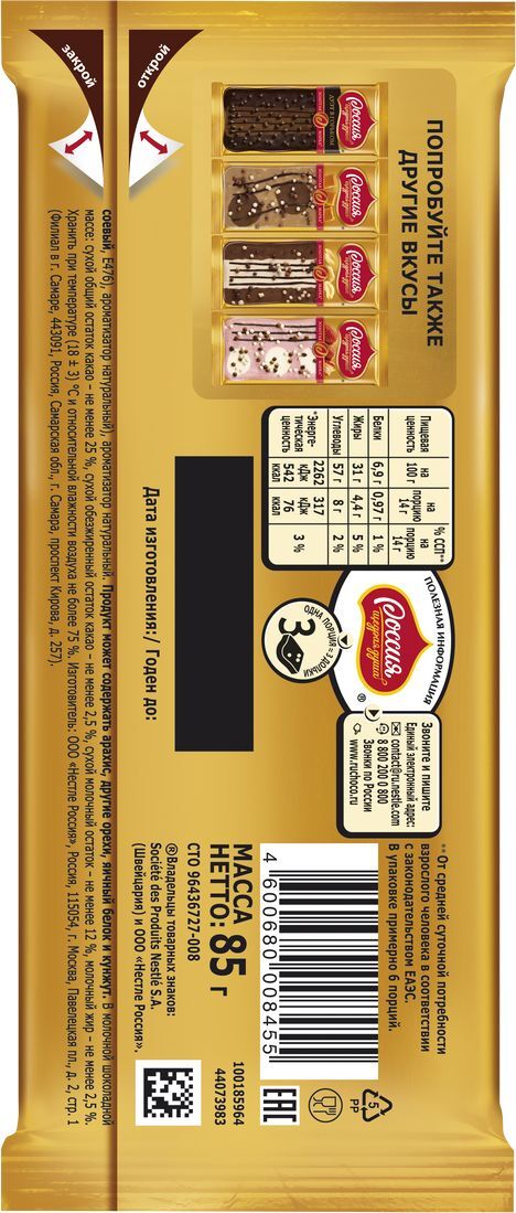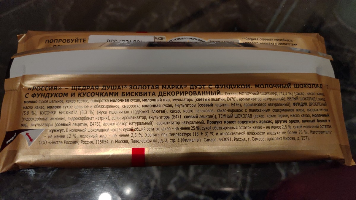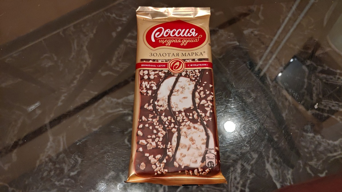 Шоколад Россия - Щедрая душа! Золотая марка Дуэт с фундуком, молочный, декорированный, 85 г