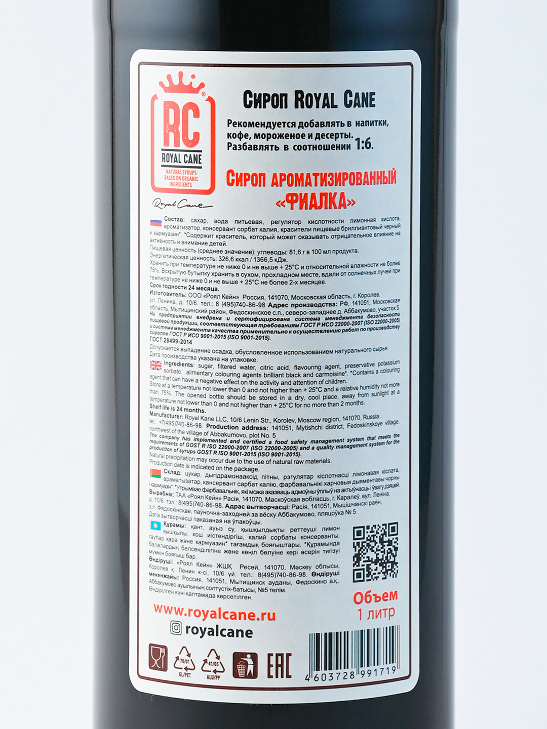 Сироп Royal Cane "Фиалка" 1 л, для кофе, лимонадов, коктейлей, чая, десертов, мороженого