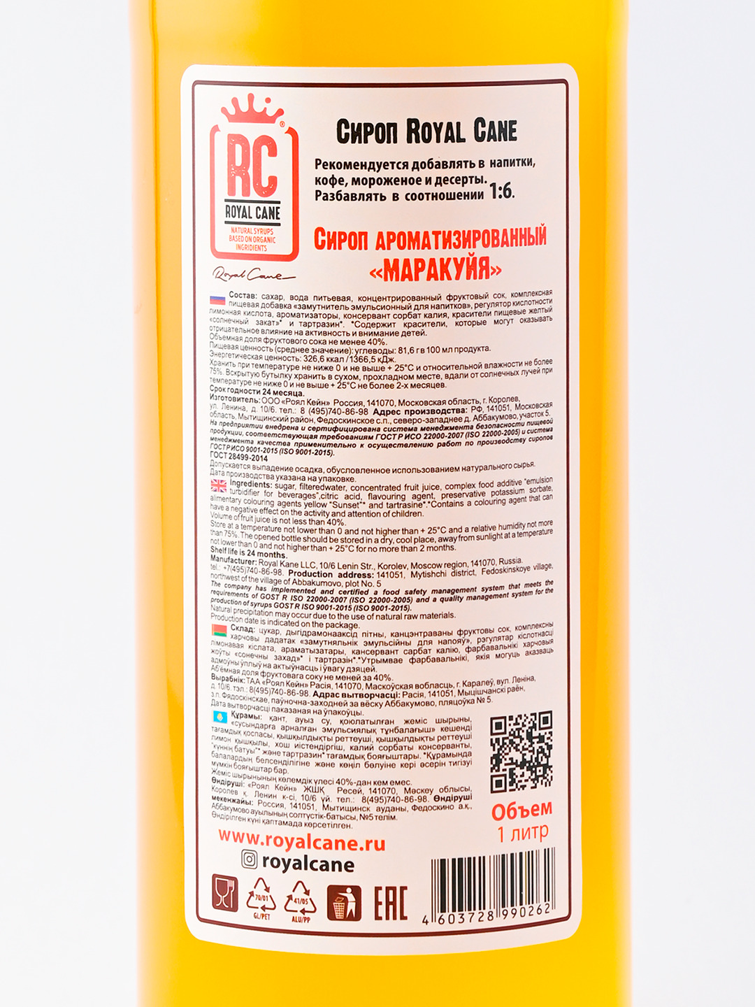 Сироп Royal Cane "Маракуйя" 1 л, для кофе, лимонадов, коктейлей, чая, десертов, мороженого
